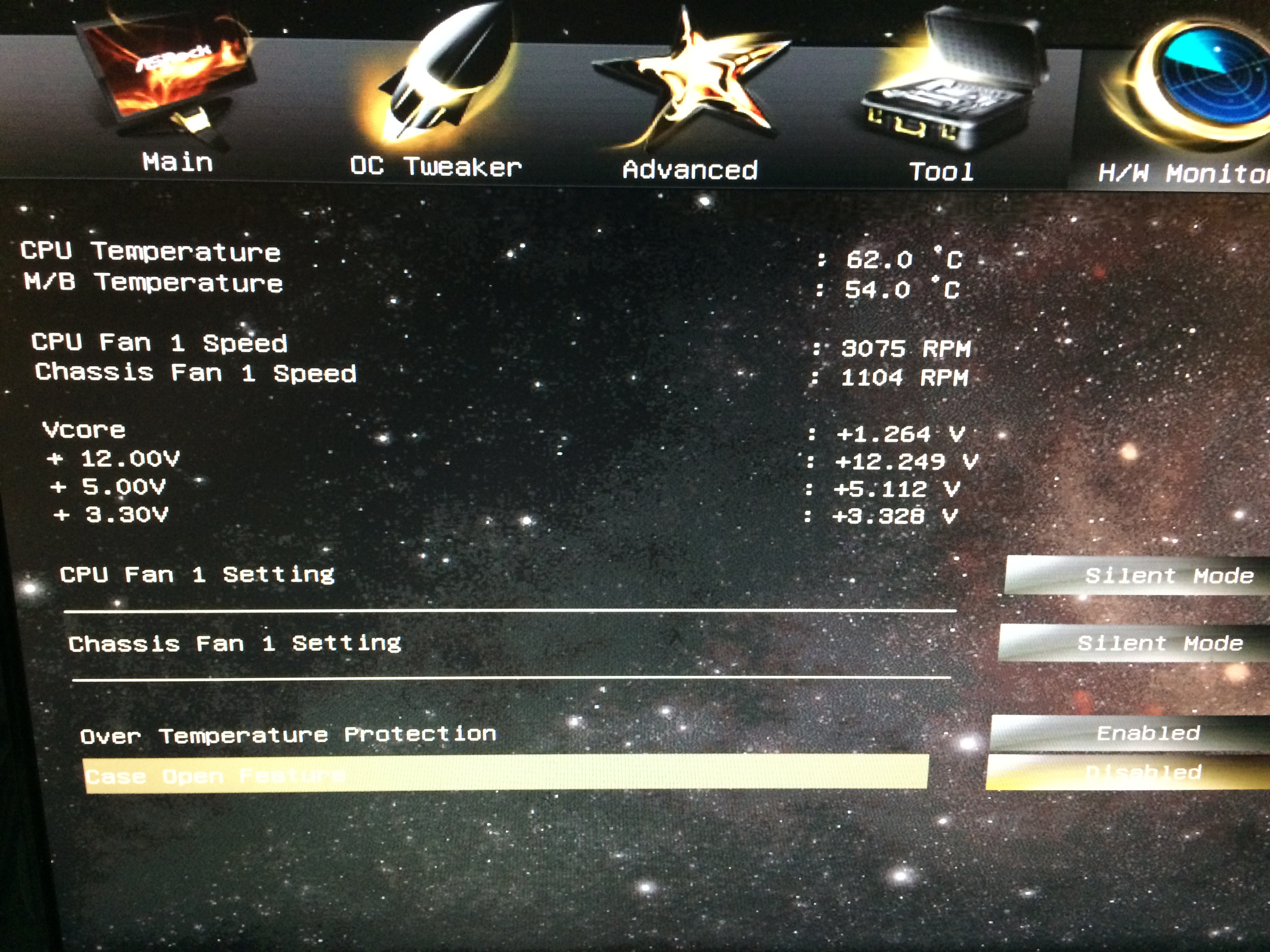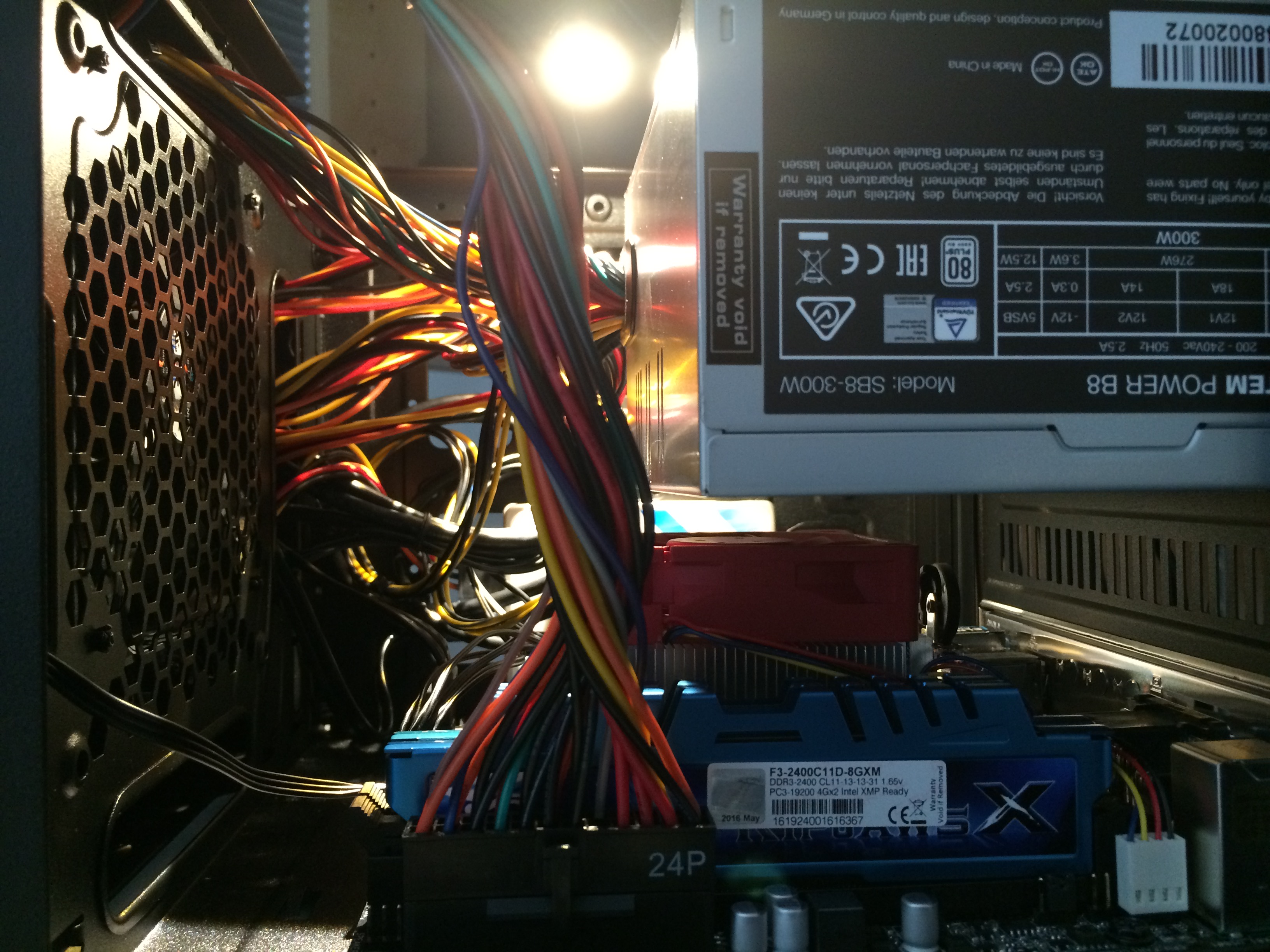 Es ist ein ASRock A68XM-ITX mit dem A10-7860K (65W) boxed gekühlt und 8GB DDR2400 plus be quiet! System Power B8 300W. Alles neu. Gestern hab ich es testweise aufgebaut und es lief wunderbar. Echt leise mit Silent-Profil für den CPU. Nach dem Einbau ins Case eben wird es auf einmal heiß und laut. Der Frontlüfter (3-pin, aber soweit ich weiß kann das BIOS von ASRock auch so einen über Spannung regeln) ist komplett frei und kann kühle Luft Richtung CPU blasen. Das NT zieht kühle Luft von oben (Casedeckel ist perforiert). Ich kann mir nicht erklären, wie das so heiß werden kann. 62 Grad CPU und 54 Grad Mobo idle! Lüfter entsprechend 3100/1100 rpm.