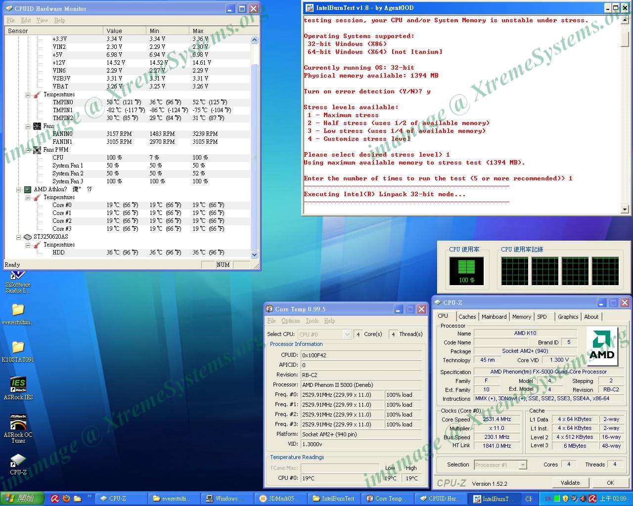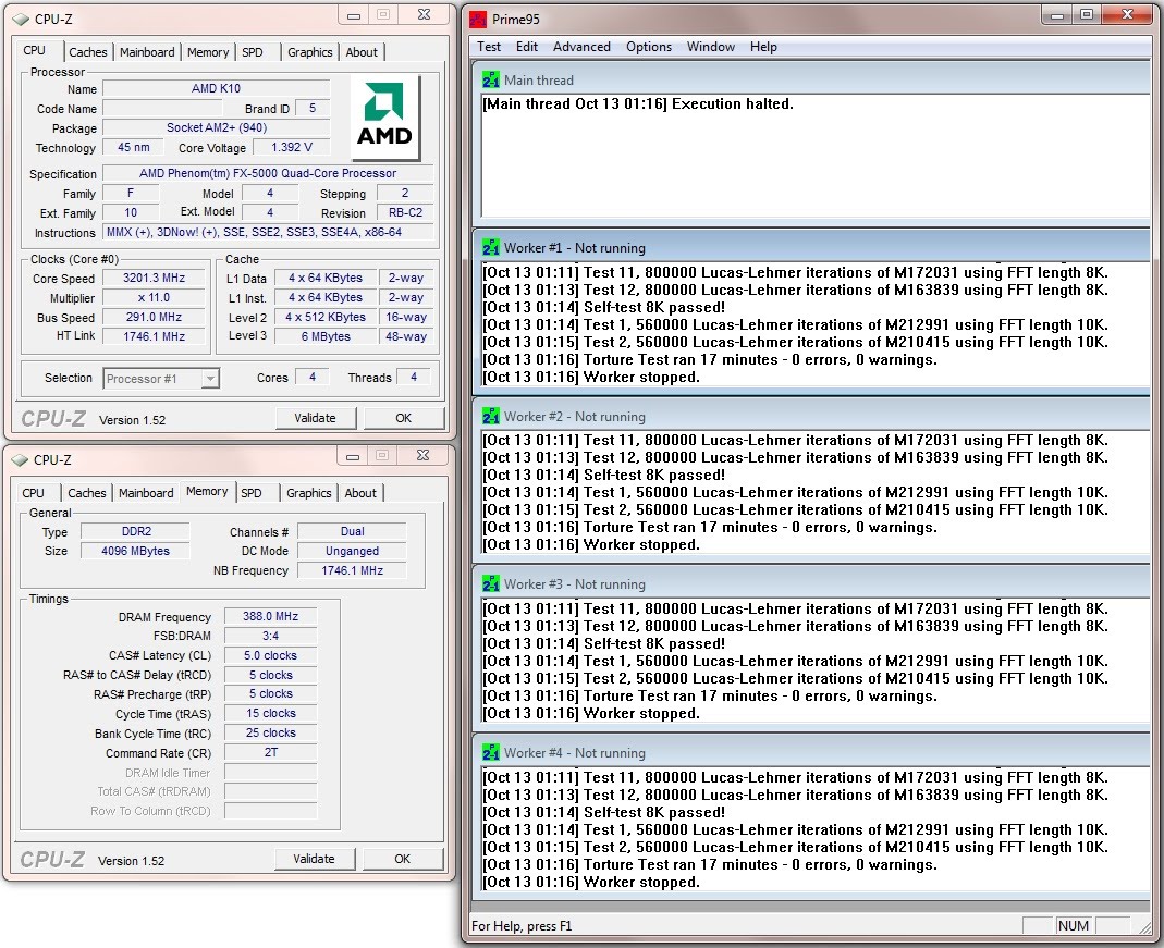 Die Freischaltung fand statt mit einem Gigabyte GA-MA790X-UD4P Board und die 4 Kerne wurden auf 3,2 GHz bei Standardspannung stabil betrieben. Die freigeschaltete CPU wird von CPU-Z als "Phenom FX-5000 Quad Core" bezeichnet. Es wird einhellig berichtet, dass diese allerdings nicht auf AM3 Boards funktionieren! Offensichtlich sind entweder die DDR3 Speichercontroller defekt oder deaktiviert.