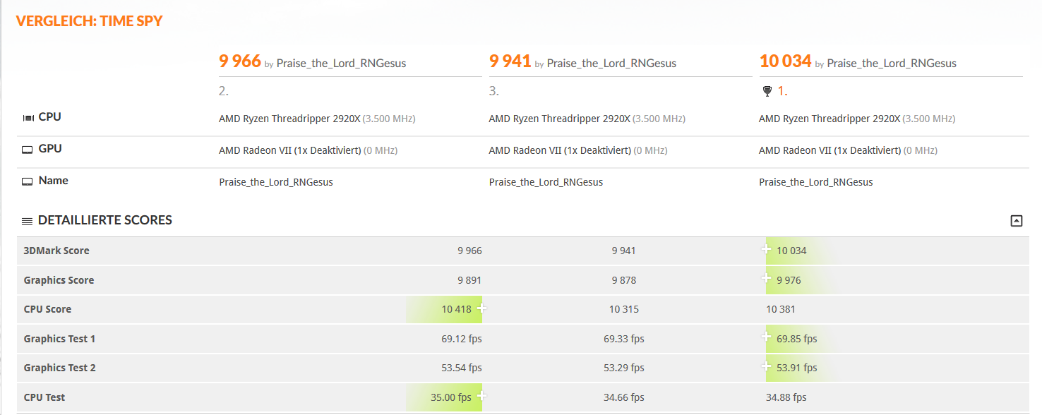 edit: Somit bist du sowohl in FS als auch in TS exact 25% über meiner Vega64 OC/UV. Da steckt also doch mehr Potential in Radeon VII als ich geglaubt hätte!