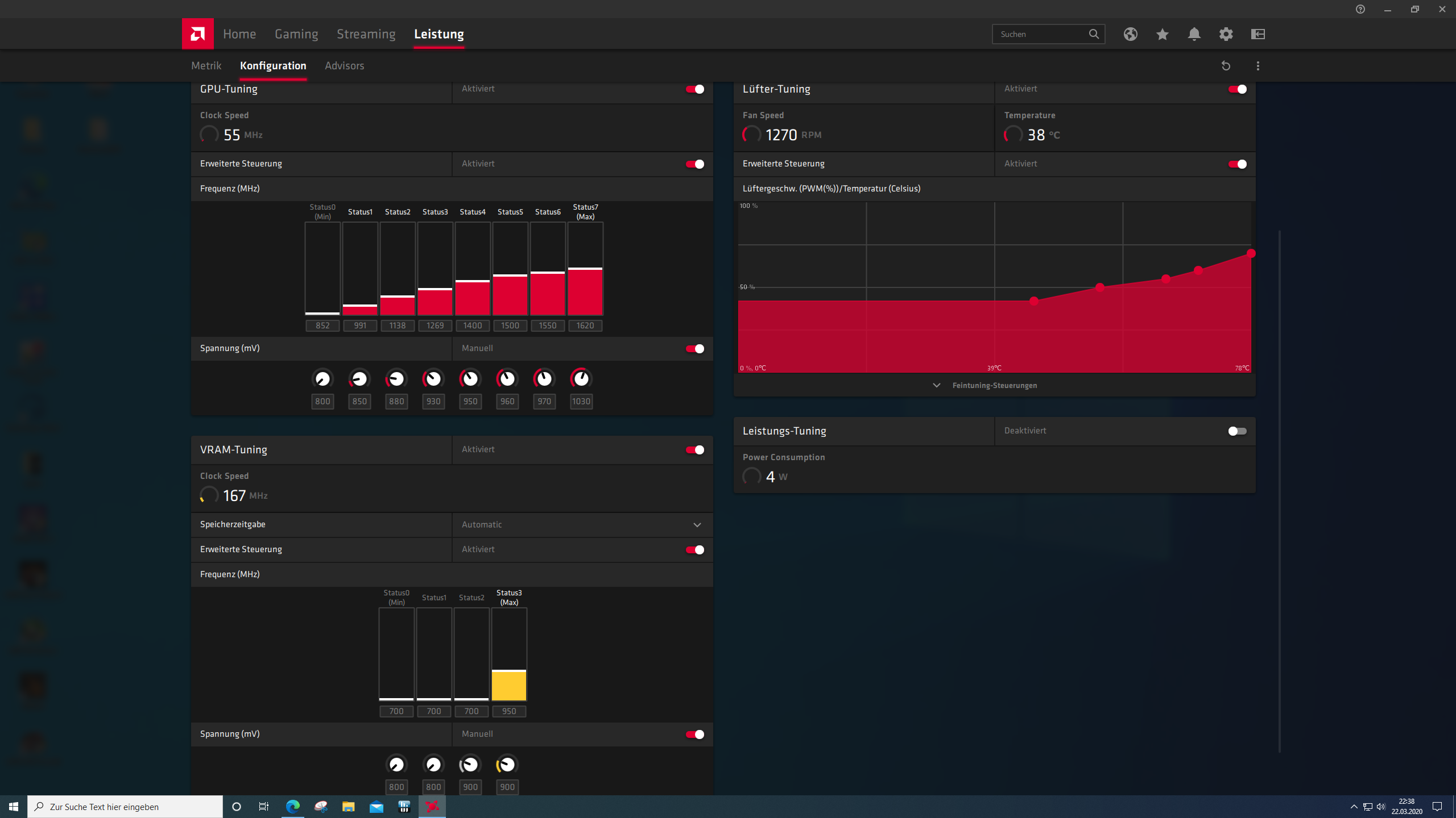 Fürn Bechmark hab ich z.B. P7 1740Mhz bei 1150mV eingestellt und die Lüfter Blasen direkt auf 75%