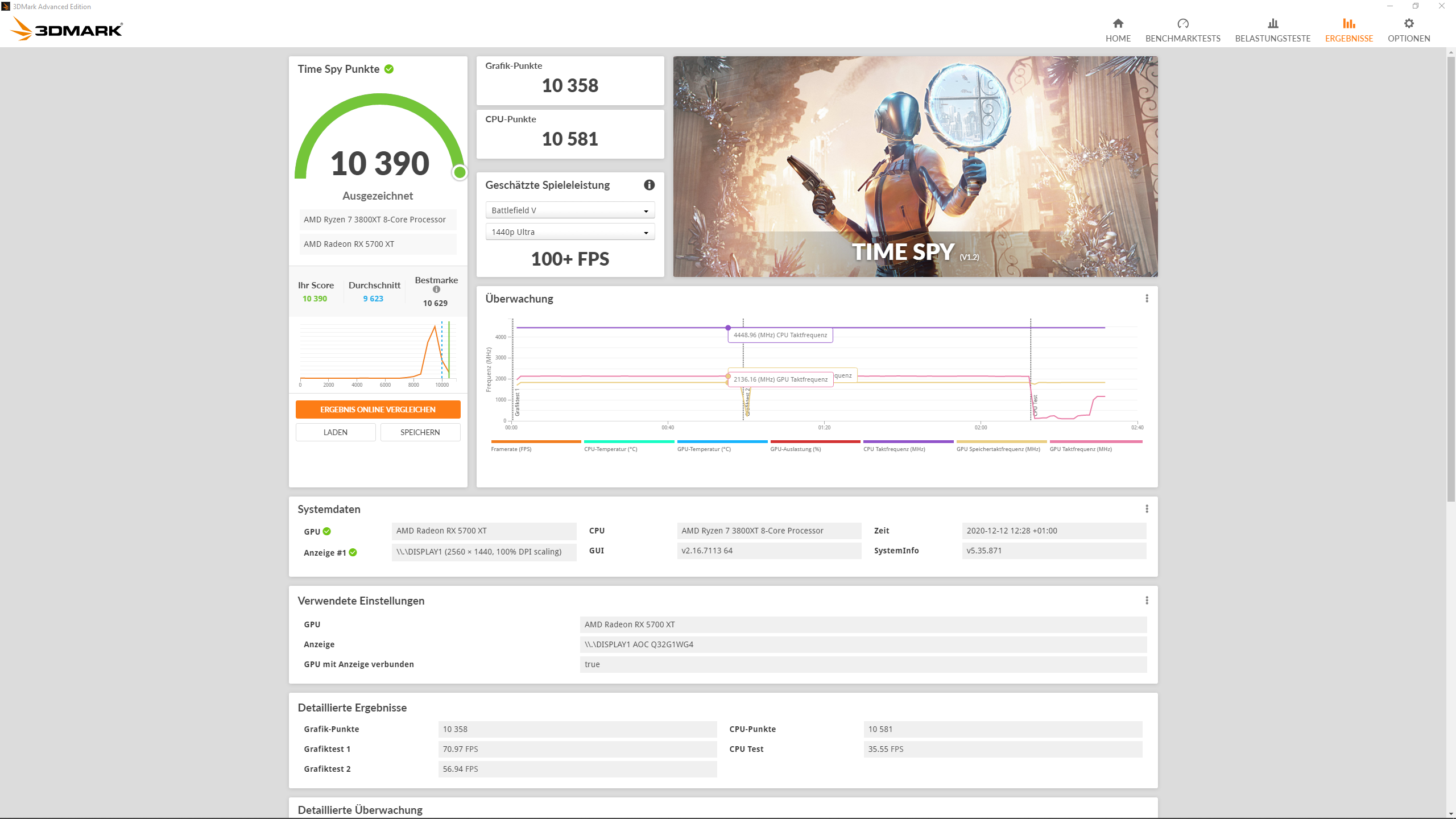 Im 3DMark Ergebnis steht bei der CPU eine Taktangabe von 4217 MHz. Dies muss ein Auslesefehler gewesen sein, da ich die CPU auf 4,1 GHz mit 1,35v gelockt habe.