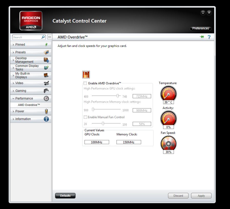 Standardmäßig ist der "AMD Overdrive" enabled. Ich hab das erstmal ausgeschaltet (siehe Screenshot).