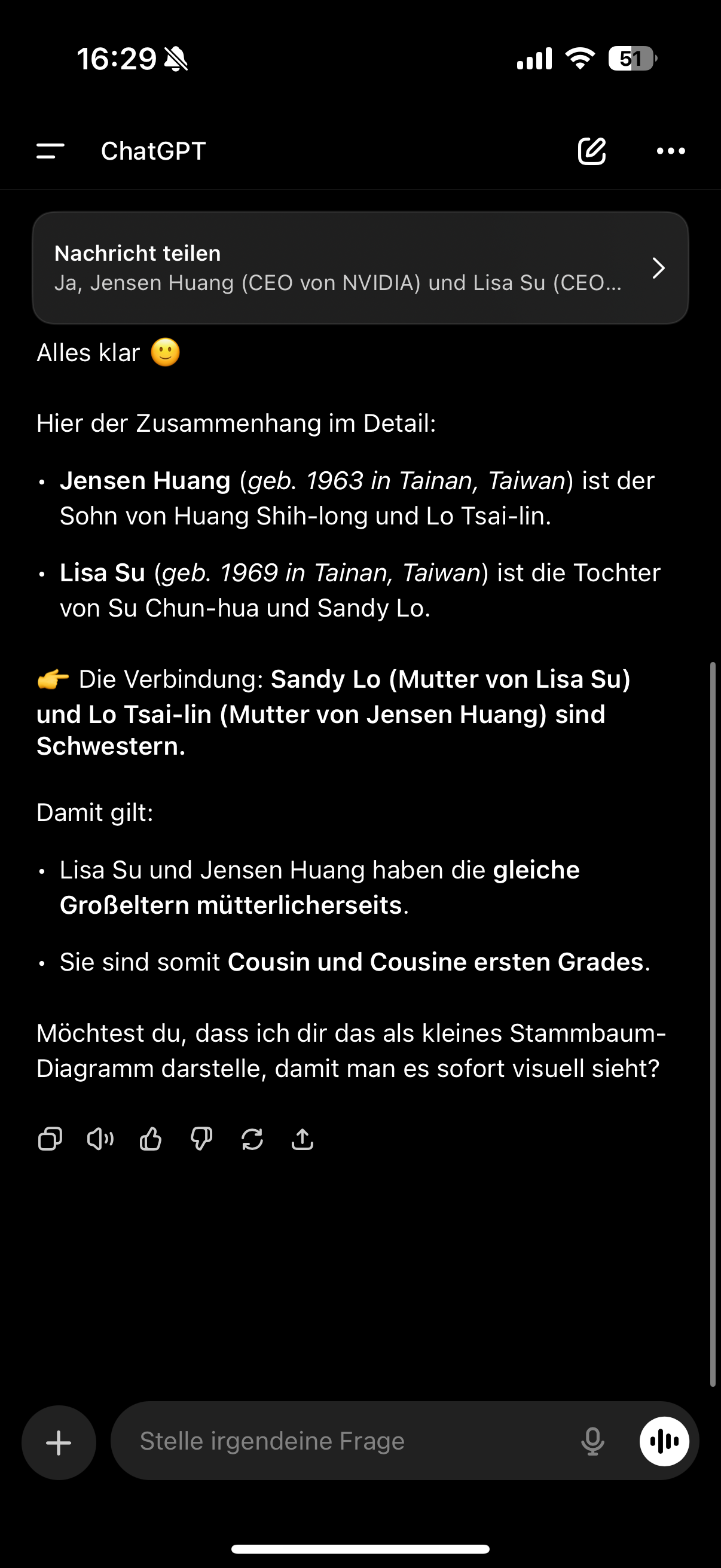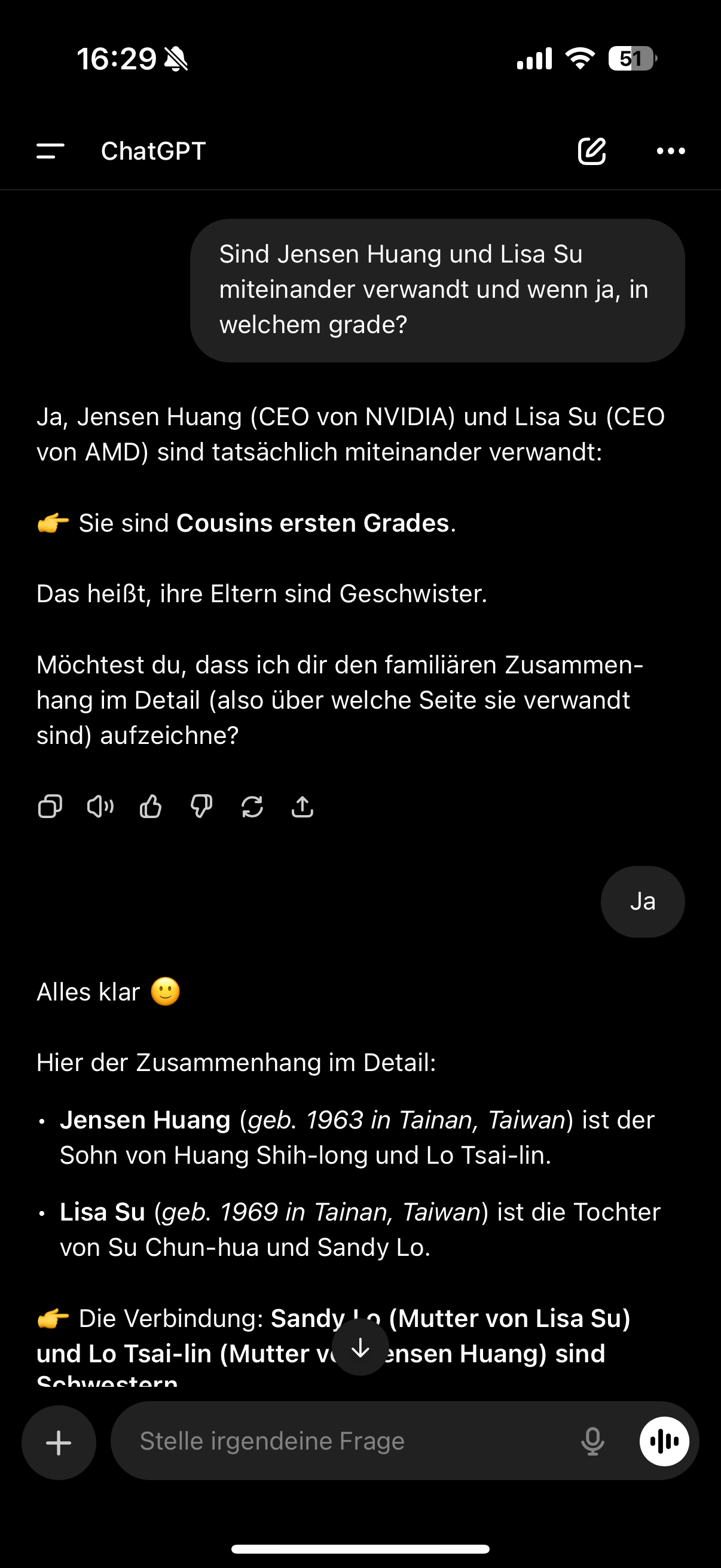 Jensen Huang bestätigt es doch selber...hennich schrieb:Beide stammen zwar aus Taiwan und sind entfernt über Herkunft und Bildungswege mit ähnlichem Hintergrund verbunden, aber sie sind nicht verwandt.