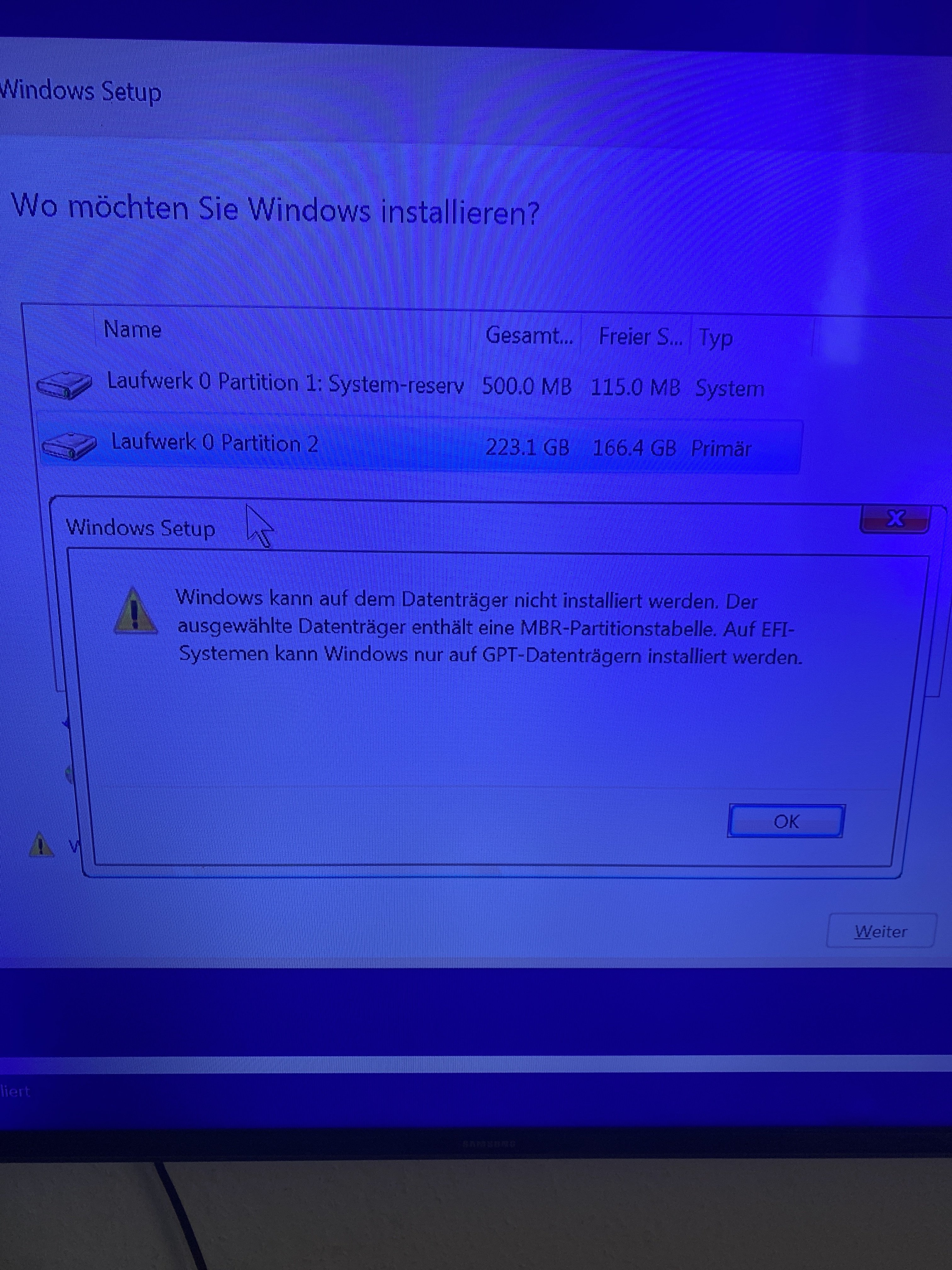 Damit die Meldung weg geht, musst du die Festplatte von mbr zu gpt konvertieren: https://www.giga.de/downloads/windo...ht-installiert-werden-gpt-mbr-so-geht-s-doch/