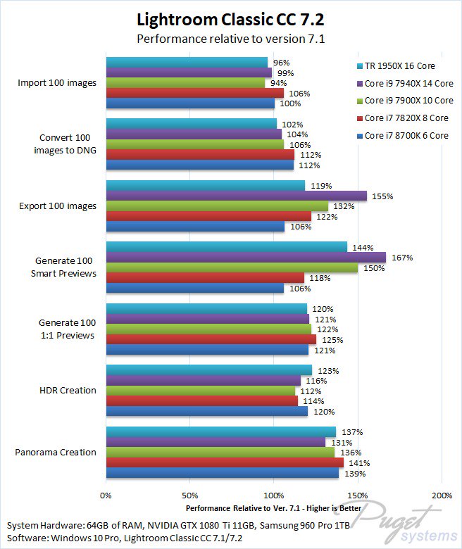 ja, in der Tat armselige Skalierung. Eher ein negativ Beispiel. Selbst bei Premiere. Aber ich kann es bestätigen. Selbst bei Premiere ist der Vorteil gegen 0, eigentlich nur beim Export present. Lightroom... ich exportiere keine 100 pics auf einmal. Mir ist wichtiger wie fix das einzele Pic und die App reagiert. Der Export geht nebenher später.