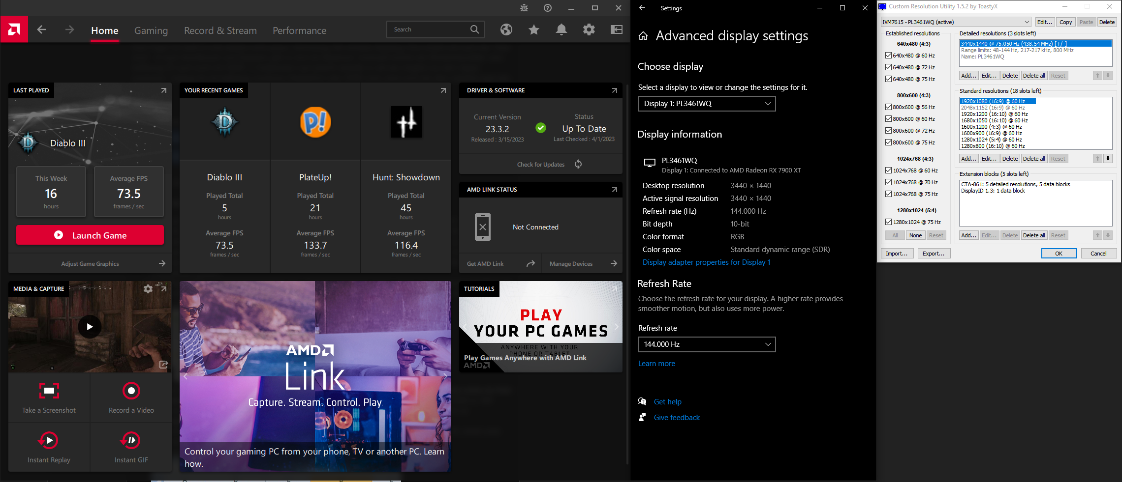 - Monitor: 3440x1440@144Hz, 1920x1200@60Hz