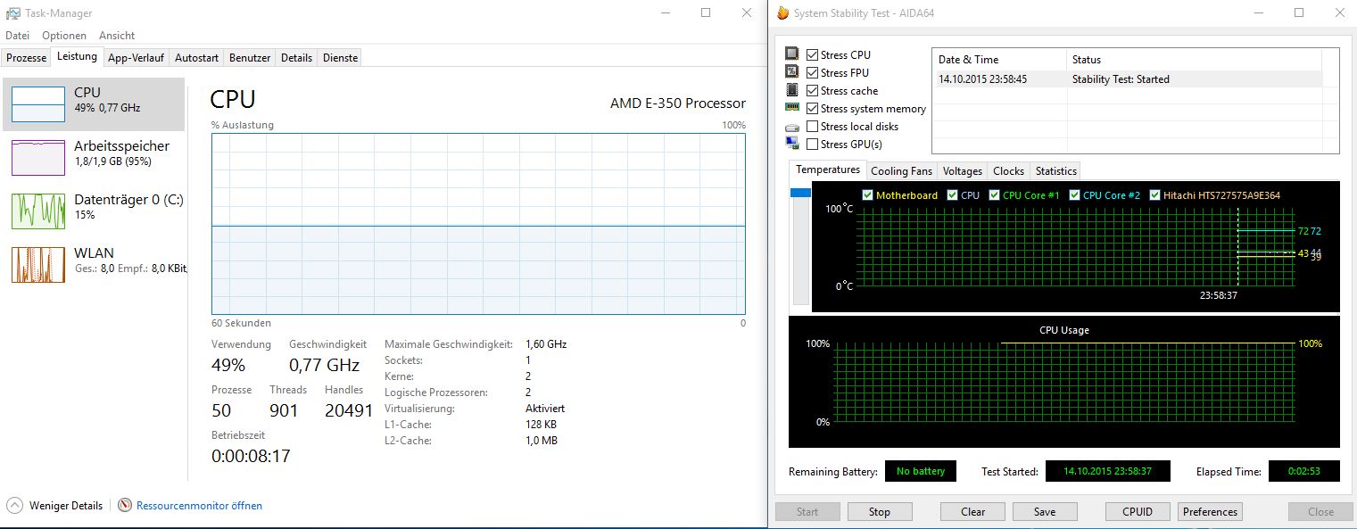 ich habe gerade einen kleinen HTPC fertig gemacht, in dem befindet sich ein AMD E-350 Prozessor, welcher 2x1.6Ghz besitzt. Selbst beim CPU Stresstest gibt es nur maximal 800Mhz. Das Windows Energieprofil ist auf Höchsteistung gestellt, die Leistungseinstellung Catalyst Center ist auf 1600-1600Mhz eingestellt. Durch die 800Mhz Begrenzung ist das Teil nun nahezu unbrauchbar... nichtmal ein Video im Firefox (z.b. auf DMAX) lässt sich wiedergeben.