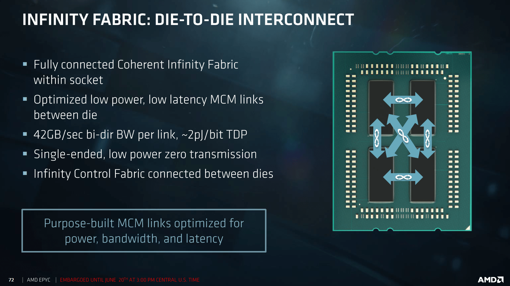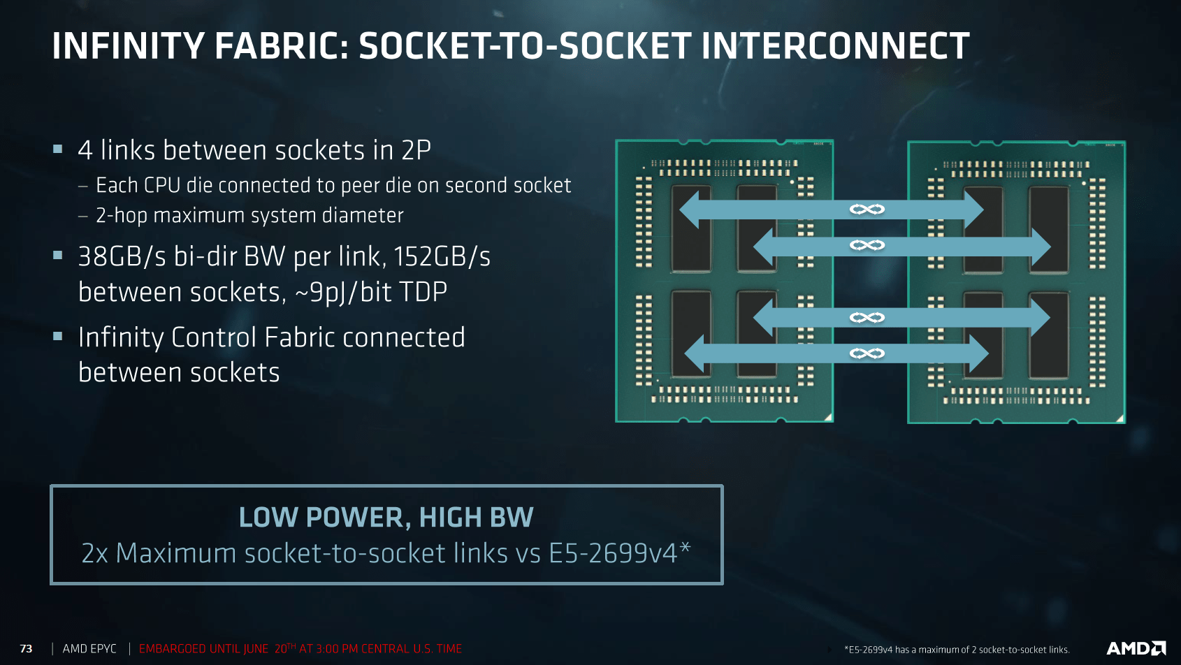 Apropos Leistungsaufnahme: Laut AMD hat die Speichergeschwindigkeit einen großen Einfluss auf die TDP der CPU. So würde zum Beispiel die TDP des Epyc 7501 bei 170 Watt liegen, wenn DDR4-2666-Speicher verbaut ist. Bei DDR4-2400 beträgt die TDP dagegen nur 155 Watt.