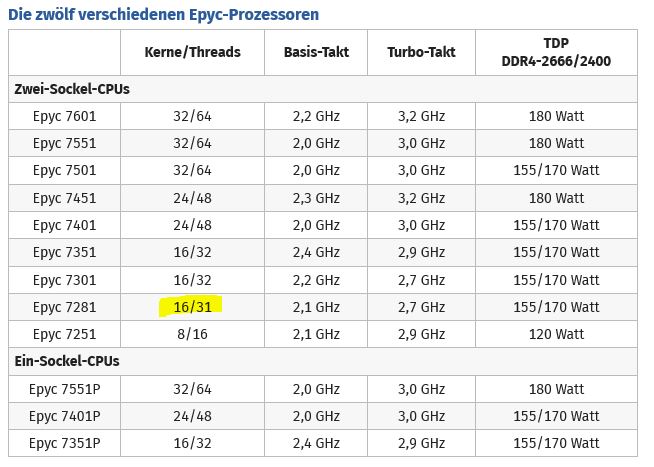 Die Taktraten fallen etwas niedriger aus als gedacht, aber das dürften so ziemlich die optimalen Taktraten für Zen sein, wo sie ihre Effizienz zeigen. Intels Architektur ist da allerdings etwas breiter aufgestellt. Je nach Anwendungsfall sind die Zen Epycs aber wirklich spannende Prozessoren. Vielleicht wäre ja noch spezielle, sehr hochgetaktete 8-16 Kerner für 1 Sockelsysteme als Workstation spannend, aber man wird diesen markt wohl durch Threadripper bedienen.