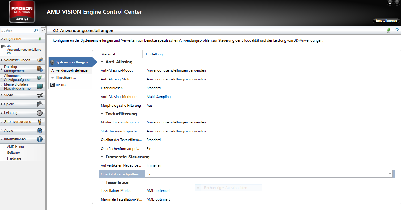 Also ich habe da nochmal Fragen bezüglich der Grafikeinstellungen im Spiel oder im Vision Engine Control Center. Da kann man sicher auch noch was verbessern etc. Sollte ich in den Treibern alles lassen und auf anwendungsgesteuert bleiben und in den spielen alles einstellen oder es direkt mit den Treibern machen? Von wegen VSync immer EIN und dreifachpuffer ( Hab gelesen soll Performence verbessern (noch weniger Tearing ( ich hasse das wie die Pest))) Und ein festes AA einstellen? Standart oder Edge Control Mulit- Supersampling all sowas Anhang anzeigen 321878