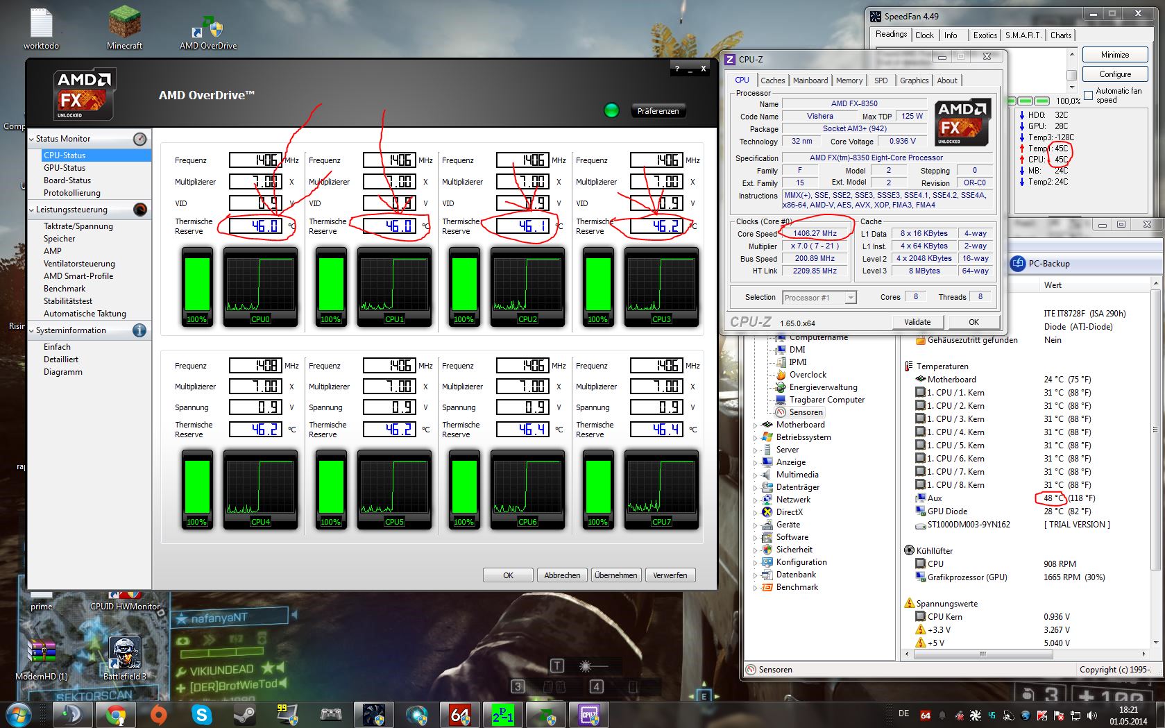 Seit ein paar Tagen Taktet sich meine CPU (AMD FX-8350)ohne Grund auf 1,4Ghz runter, Standard Takt 4Ghz-Turbo 4,2Ghz. Habe schon etliches gelesen und ausprobiert, aber nichts hat geholfen. Viele sagen ja das die Temperaturen zu hoch sind was aber in meinem Fall nicht so ist.