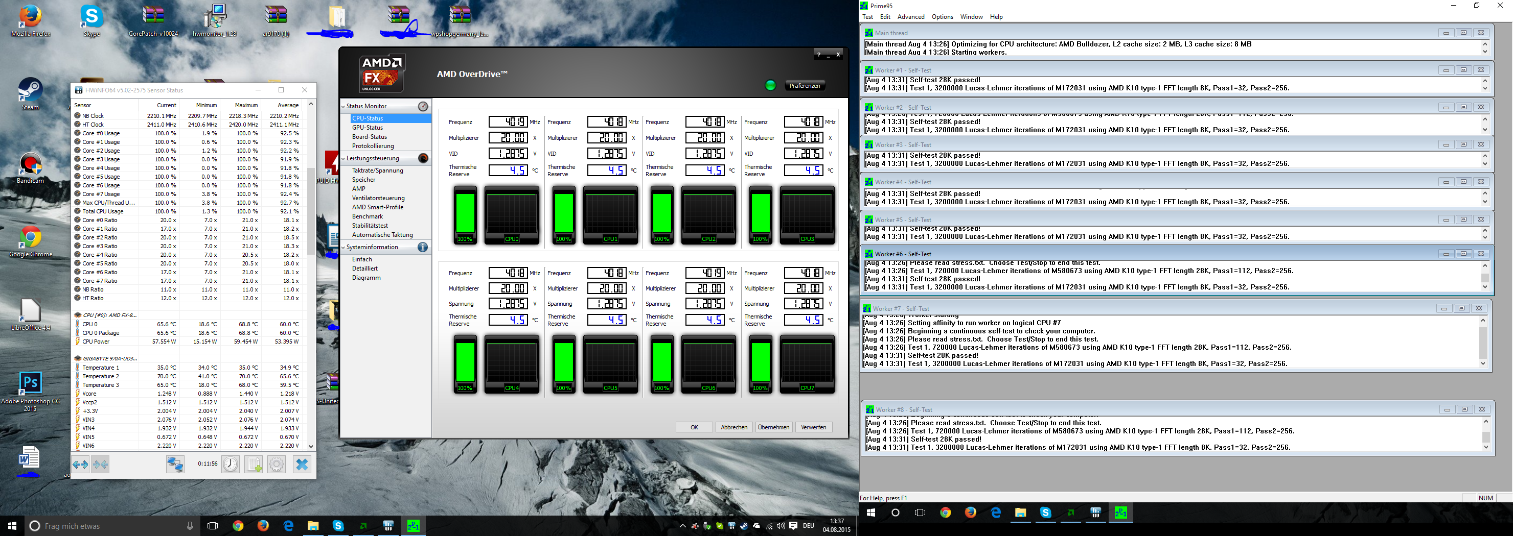 Im Anhang findet sich ein Screenshot vom Ausmessen bei Prime95. Wegen der hohen minimalen Temperatur bitte nicht wundern, da ich in HWiNFO64 unten den Timer zurückgesetzt habe.