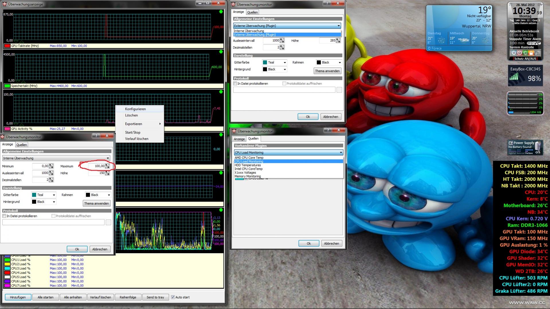 Ins Feld rechts Klicken,auf Konfigurieren,Anzeige,Maximum von 1000 auf 100 ändern,da die Auslastung nur bis 100% geht und alles drüber nicht deutlich zu erkennen ist.