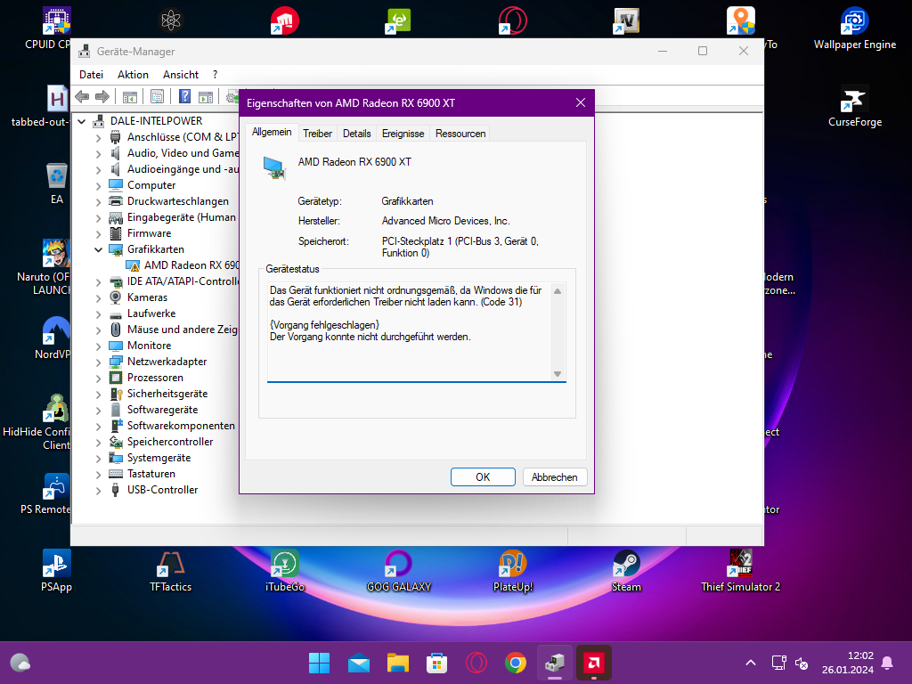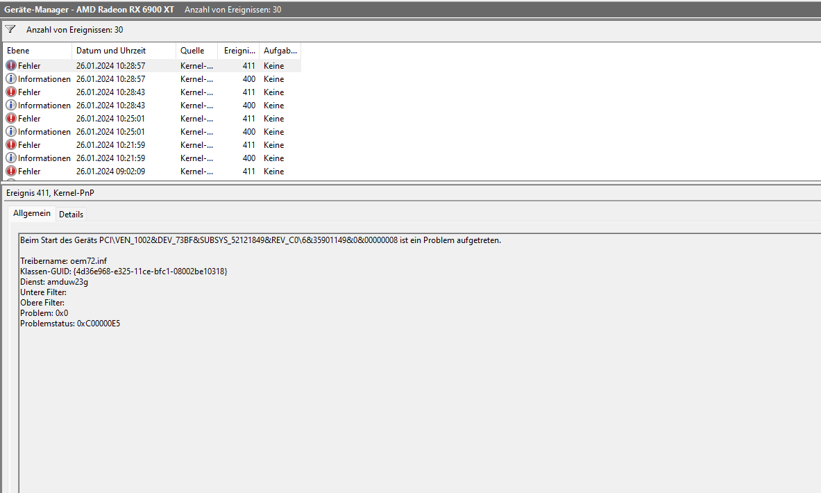 Jedes mal wenn dieses Problem auftaucht starte ich meinen Pc neu darauf sind sämtliche Treiber nicht mehr Installiert, Die treiber über den Geräte Manager zu Installieren scheint nie zu funktionieren wie die Treiber direkt von AMD herunterzuladen scheint auch nie zu gehen, bis zu dem Punkt wo ich meine Grafikkarte wieder ihm Geräte Manager "Aktiviere" spricht geräte wird deaktiviert nach dem aussetzer ich starte mein pc neu und das geräte ist deaktiviert.