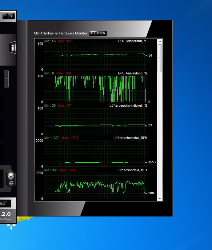 Ich habe Power Limit nur um 25% erhöht. Die Kernspannung um 31 mV gesenkt. Der Takt 1.020 MHz wird gehalten und die Karte verbraucht sogar etwas weniger als vorher. Und ist sogar ein paar Grad kühler.
