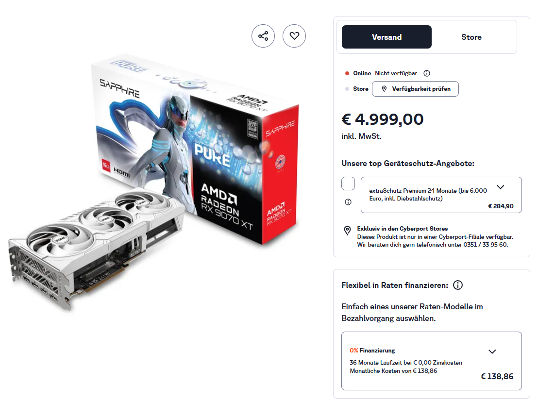 - SAPPHIRE PURE AMD Radeon™ RX 9070 XT GAMING Grafikkarte 16GB GDDR6 HDMI/DP* (4.999,00 €, Cyberport)