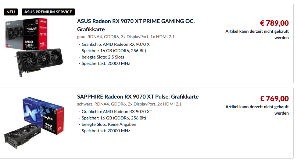 Bei Alternate ist kein einziges dieser Modelle liefer- bzw. bestellbar, d.h. diese Preise sind keinen Pfifferling wert. Auf diesem Niveau gehen im Moment non-XT-Modelle über die Ladentheke.Northstar2710 schrieb:Und wenn wir jetzt die alternate Preise für die 9070XT anschaue gibt es 5 modelle von 769€-799€