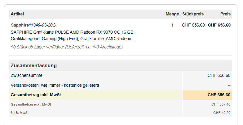 Kann man irgendwie nach Österreich oder Deutschland bestellen bei dem Shop? Foletti Computer StoreCaptain Mumpitz schrieb:In der Schweiz sind mittlerweile auch einzelne Modelle erhältlich. Hab soeben eine 9070 Pulse bestellt, sollte nächste Woche eintreffen.