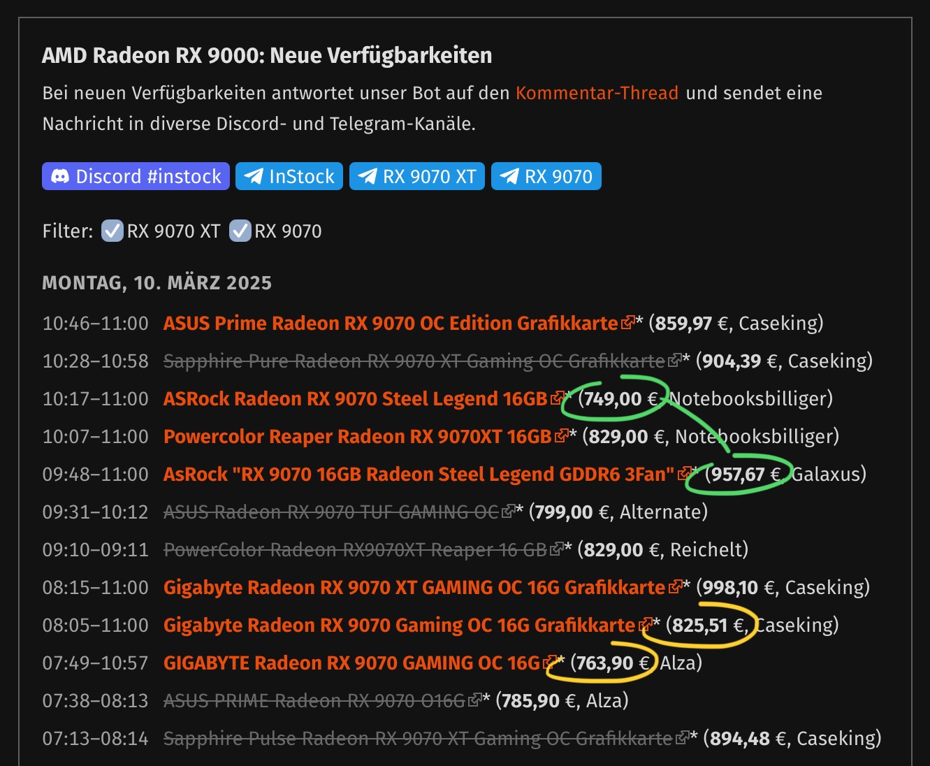 Hab ein bisschen Geduld... binnen 3 Tagen hast du ne 9070 XT für ~700 EuroAndiD schrieb:Mittlerweile sind die 7090XT Preise so hoch dass ich am Ende dann doch wieder bei grün lande.