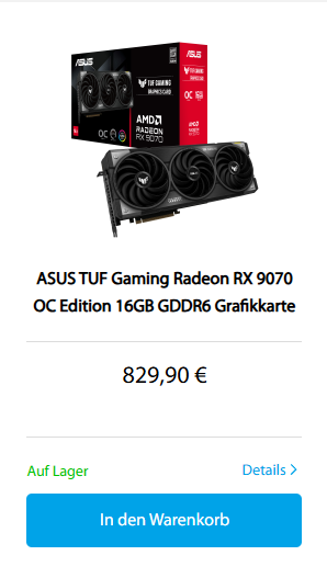 - ASUS TUF-RX9070XT-O16G-GAMING 16GB DDR6, HDMI/DP* (899,95 €, Computeruniverse)