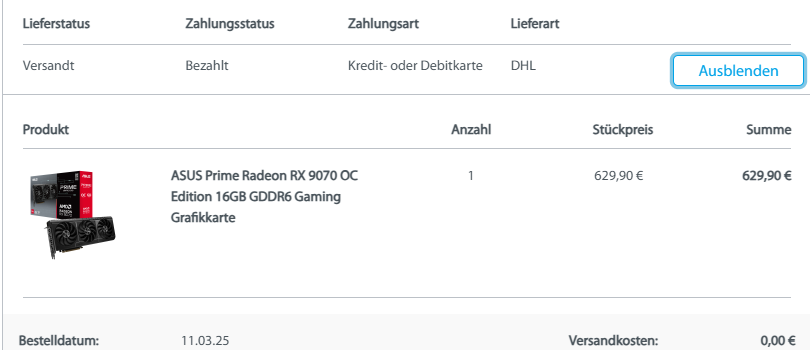 Bei Alternate sind die Karten gefühlt einfach nur gelistet, aber nie verfügbar. Oder ich bin einfach langsam.Sombatezib schrieb:Alternate.de hat gerade eine 9070 Nitro+ zur UVP+10€ (789€).
