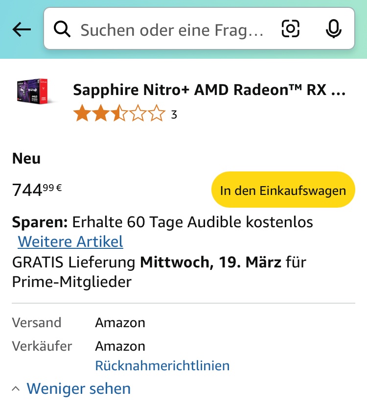 Auf der einen Seite war ich froh, überhaupt eine 9070 über Asus zur UVP von 629€ ergattert zu können, aber auf der anderen Seite wollte ich eigentlich eine XT. Nun habe ich die Karte schon an meinen Kumpel verkauft, der wollte die unbedingt haben. Ich hätte die gefühlt 50 Mal verkaufen können. Ich warte, bis ich eine Gigabyte AORUS XT zur UVP bekomme. Geduld ist eine Tugend. Lange wird das aber nicht mehr dauern, die erste Marktsättigung ist da.