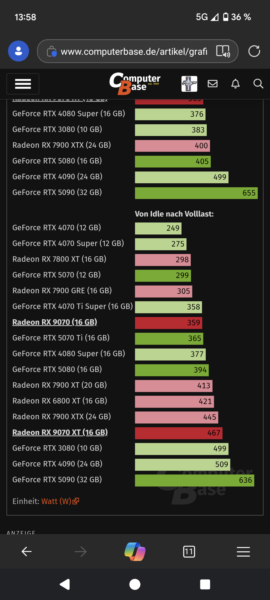 Da wäre bei der 9070xt Nitro+ 407W und bei der 5070Ti 414W.