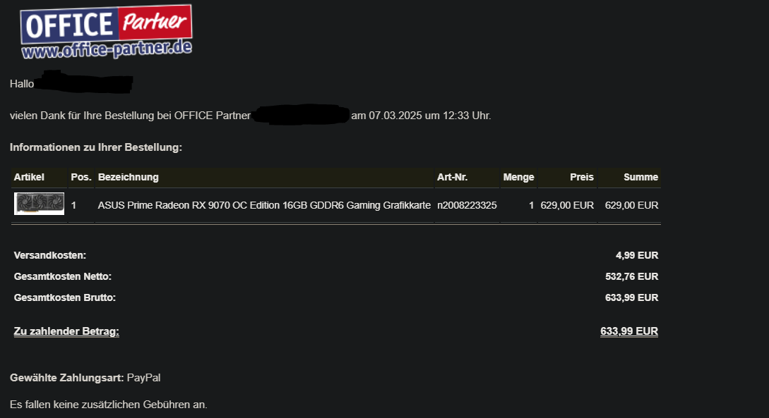 Vielen Dank an ComputerBase für den Ticker und Dank auch an die User die einige hilfreiche Kommentare gepostet haben. Folgend der bisherige Verlauf der Bestellung einer XFX 9070 SWFT bei Alternate: