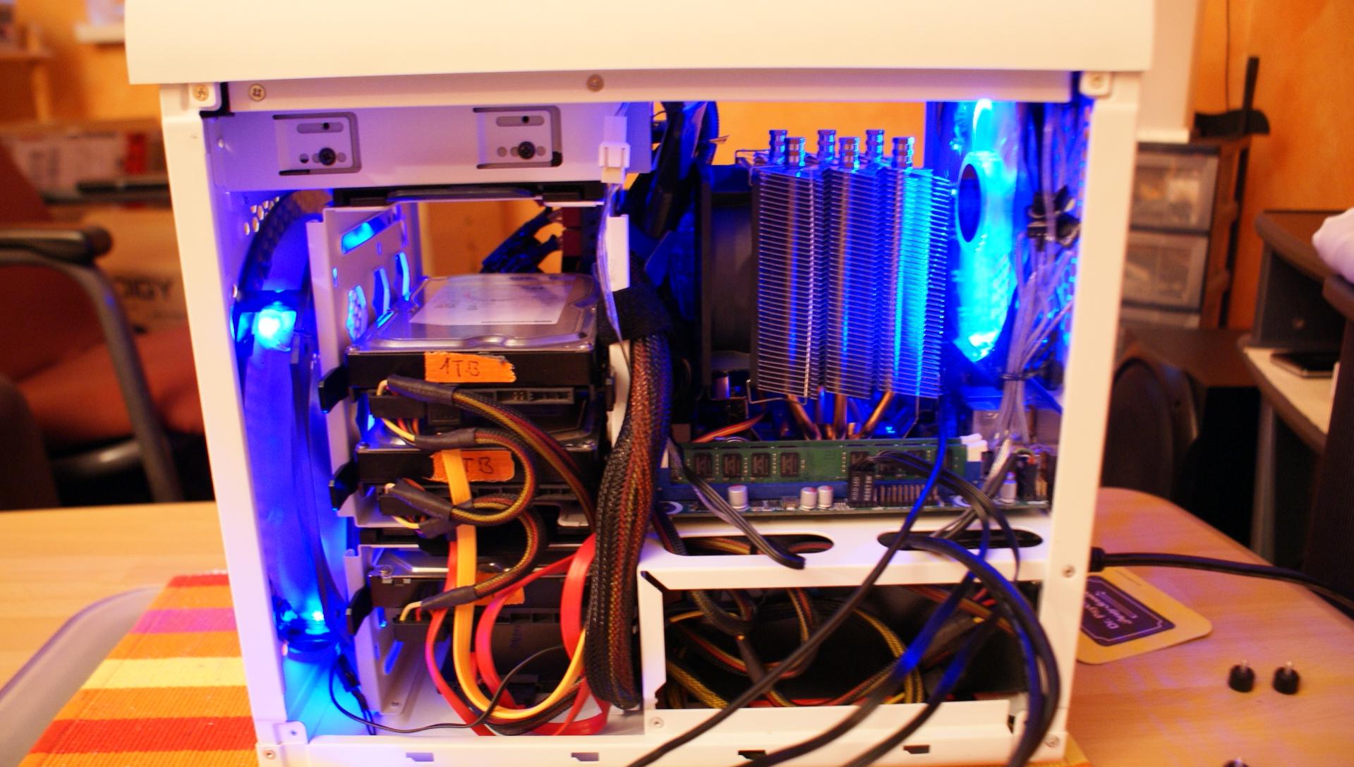 1.) habe ich die Festplattenkäfige um 180° gedreht (steht in der Anleitung wie) damit ich 3x 3,5" Festplatten verbauen kann, eine 2,5" SSD (am Boden unter den HDD Käfigen) und weiterhin eine lange Grafikkarte nutzen kann. Lob an Bitfenix! In meinem Lian Li Q08 hatte ich 4 normale 3,5" bevor ich auf eine SSD umgestiegen bin. Deshalb musste eine konventionelle HDD raus weil das ITX Board "nur" 4x SATA hat Zusätzlich dazu kann man die ganzen Kabel alle hinten verstecken und wuseln da nicht auf der Seite der Grafikkarte rum. Dazu eignet sich der Platz neben dem Netzteil sehr gut