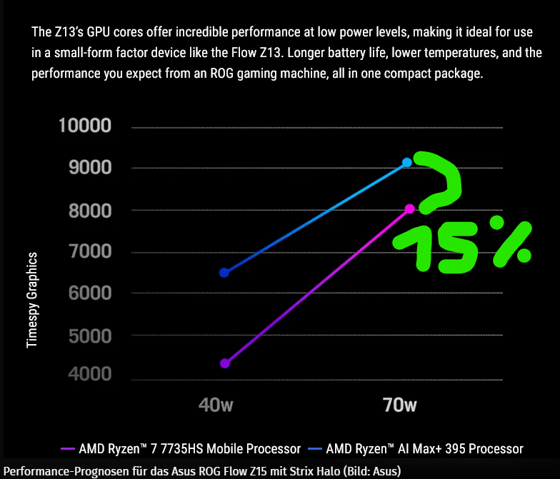 Ich hoffe, dass ich damit falsch liege....ich habe seit einigen Wochen das Vivobook mit HX 370 und selbst gegenüber dem 7940HS ist der Leistungssprung definitiv spürbar, v.a. beim Grafikchip. 7 days to die läuft z.B. bis 2560x1440 mit 40-60fps (hohe details). Das war mit der 780m nicht möglich. Die eGPU ist aber immer noch meilenweit schneller und das wird auch das Problem für AMD sein: Wer ne Kiste zum spielen will, bekommt ein Gerät um die 1000 Euro mit RTX 4060. Klar: Meistens grösser und schwerer. Aber wenn der Fokus eben Spielen (Evtl. hat AMD deswegen nicht so stark damit beworben) ist, weiss ich nicht, ob das Konzept am Ende aufgeht.