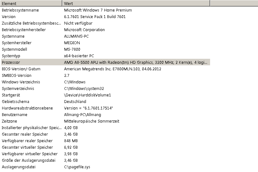 Prozessor:AMD A8-550 APU with Radeon(TM) HD Graphics, 3200MHz, 2Kerne, 4logische Prozessoren,