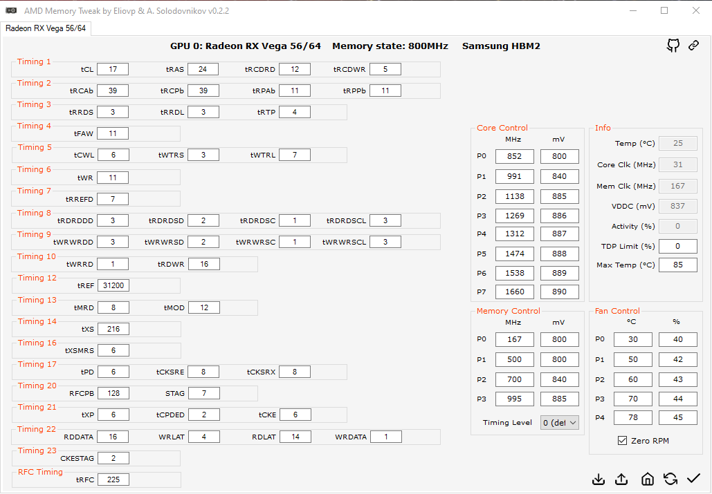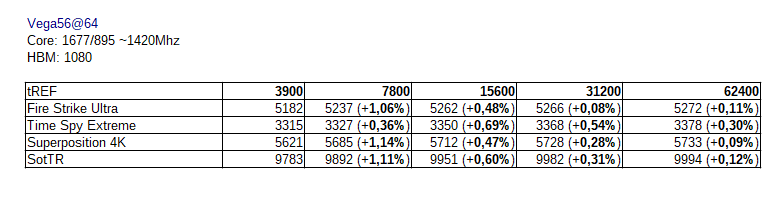 Letztlich hat sich beim weiteren Optimieren dann herausgestellt, dass meine Vega 56 bei 955 Mhz genau von einem Timing stark begrenzt wird, der tRFC. Ein Erhöhen dieses Timings von 208 auf 225 ermöglicht bereits einen stabilen Betrieb bei 995 Mhz. "Massiv" Leistung auf beiden Vega karten bringt das Erhöhen der tREF. Allein durch dieses Timing sind 1-2% an Leistung zu gewinnen.