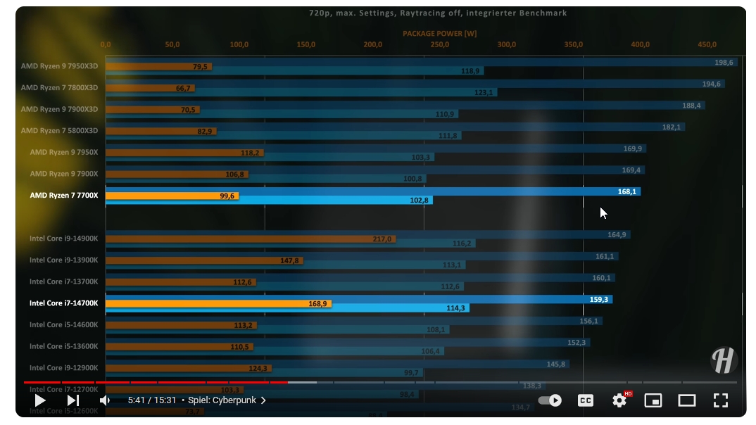 da kommt der i7 ganz schlecht weg. Mit den Limitierungen steigert er aber seine Effizienz ganz gut, das stimmt tatsächlich. Im konkreten Vergleich zw. AMD und dem i7 nähern sie sich doch an. aber wenn man den schon stark limitiert, kriegt er seine volle Leistung nicht, im genauen Vergleich bei Cyberpunk schneidet auch hier AMD besser ab, sogar der 7800X3D mit nur 66,7W der i7 65W mit 122,7, dagegen der 7800x3d >190, der 7950x3d noch höher, aber auch 88W
