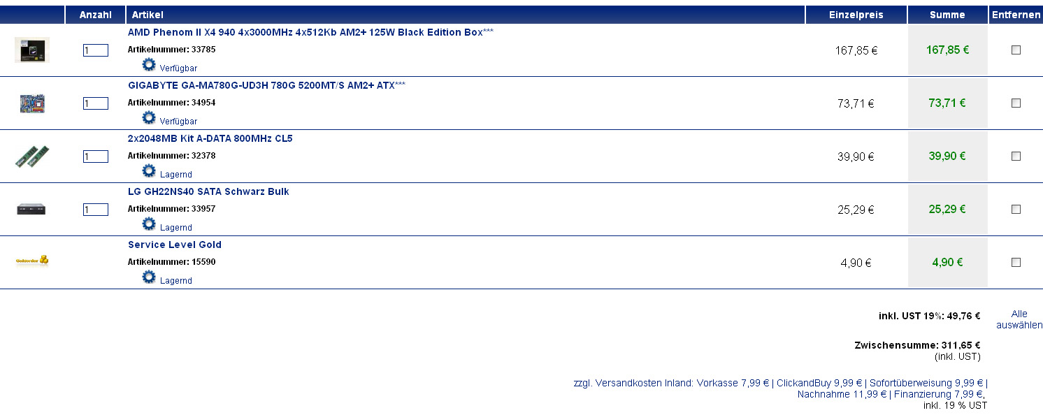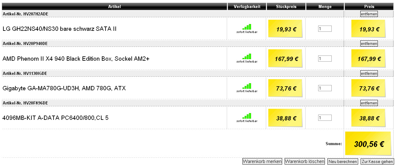 In allen genannten Preisen sind noch 21,43€ für ein LG GH22NS40/NS30 bare schwarz SATA II Laufwerk miteinberechnet. Bestellt wird bei www.hardwareversand.de. Versand ist bei der 300€ nicht mit eingerechnet!