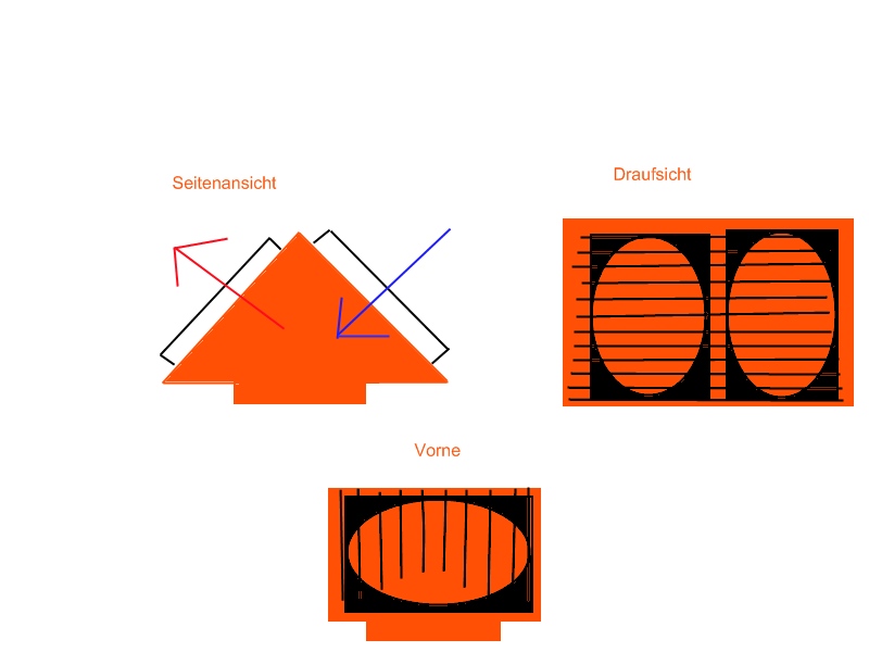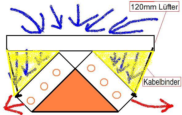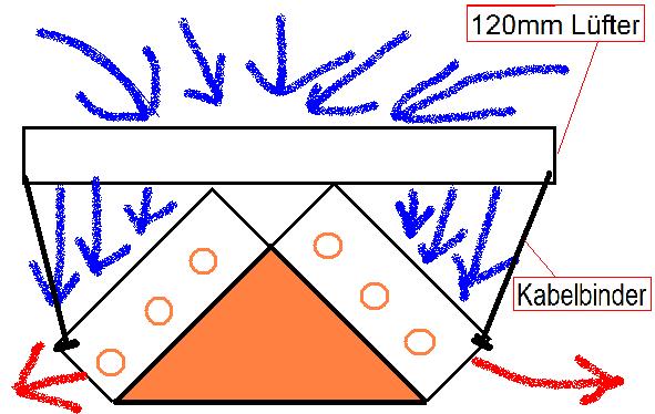 Also Bild 2 Lüfter weg, Unterseite von einem Dritten entfernen, wo der Lüfter war montieren, einen normalen mit der Unterseite darauf befestigen, 4 Headpips anfertigen,