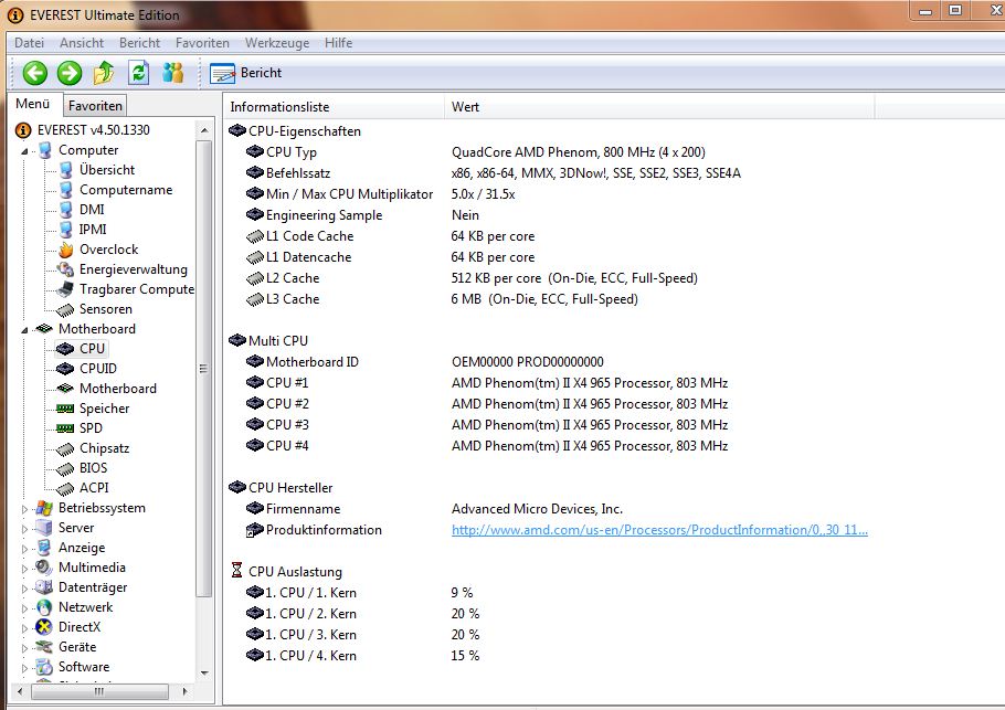 Meine heute neu erworbene AMD Phenom II X4 Black Edition 965 CPU läuft auf meinen Asus M2N-E Mainboard mir nur 800 MHz. Dieser Wert wird auch im Bios angezeigt.