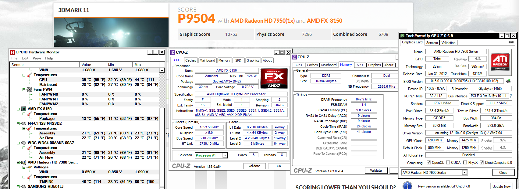 Das System zog zu der Zeit übrigens bis zu 506 Watt aus der Dose (mit Bildschirm ~30-50Watt), die CPU wurde mit 1.4V max. 45°C warm, die GPU seltsamerweise 72°C obwohl sonst bei gleichen Versuchen maximal 67°C erreicht werden.