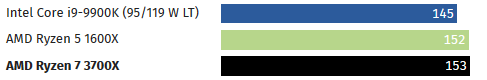 Der gesamte PC kratzt in dem Szenario an der 290-Watt-Marke – das ist höher als selbst mit dem 18-Kern-Prozessor Intel Core i9-7890XE auf der X299-Plattform. Aber auch für den Core i7-9700K ist diese Disziplin kein Aushängeschild: Der Core i7-7820X mit acht Kernen aus dem Vorjahr genehmigt sich auf der größeren Plattform eine geringere Leistungsaufnahme.