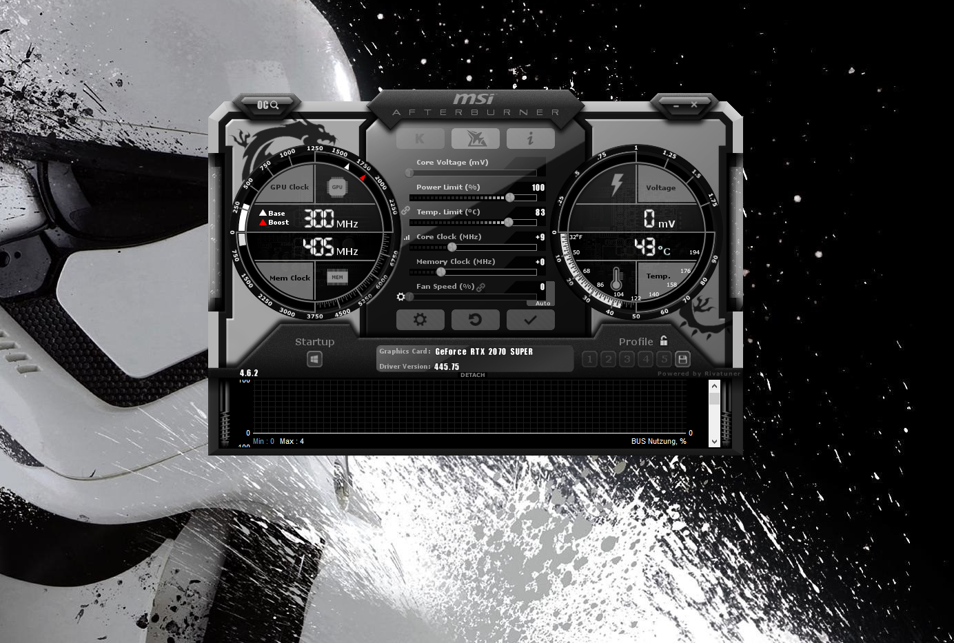 MSI Afterburner ist ein Tool, um die Grafikkarte zu übertakten und die Lüfter-Drehzahl festzulegen. Es wird auch verwendet um Informationen der Grafikkarte zu überwachen.