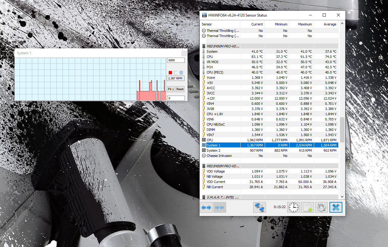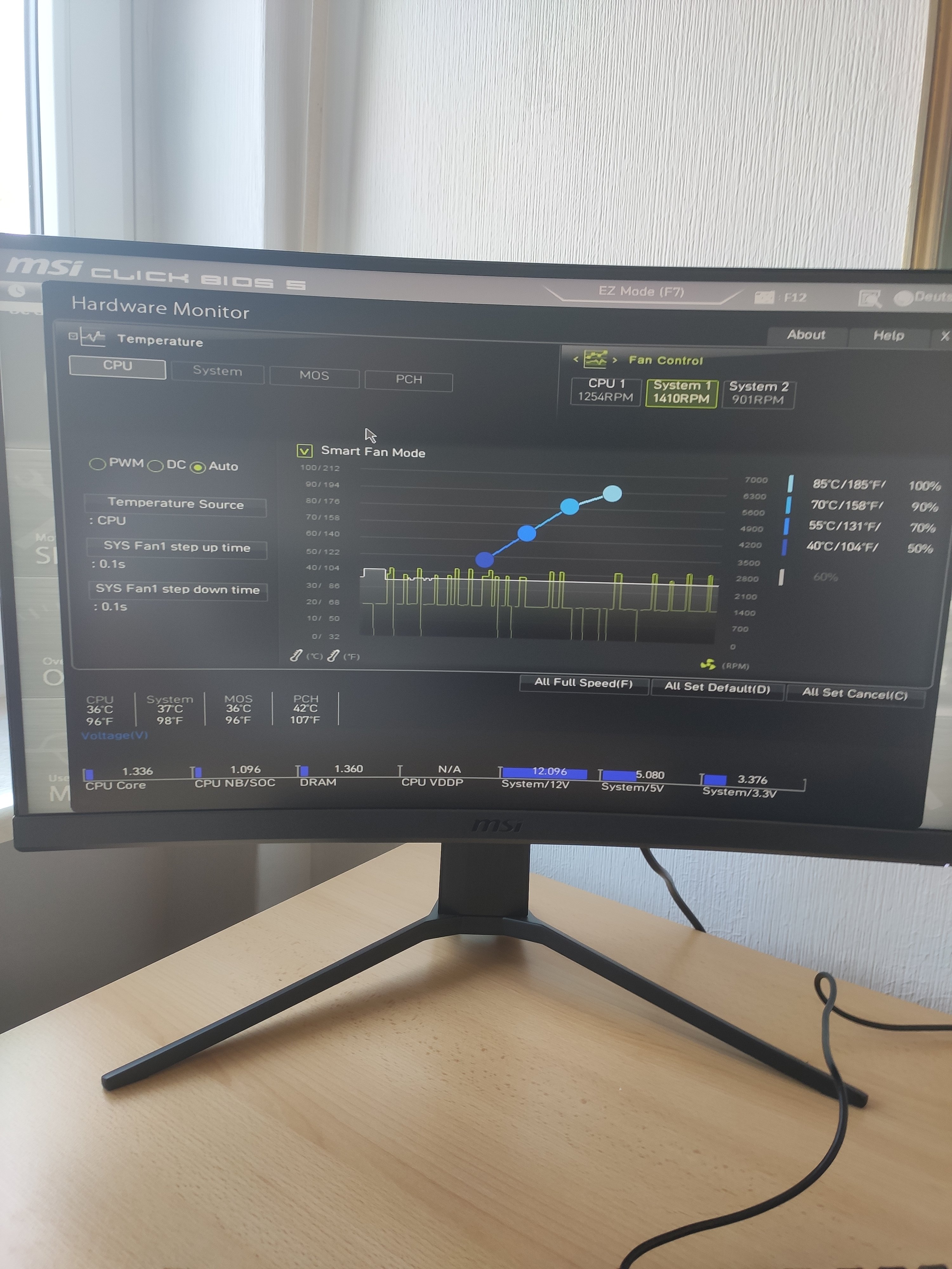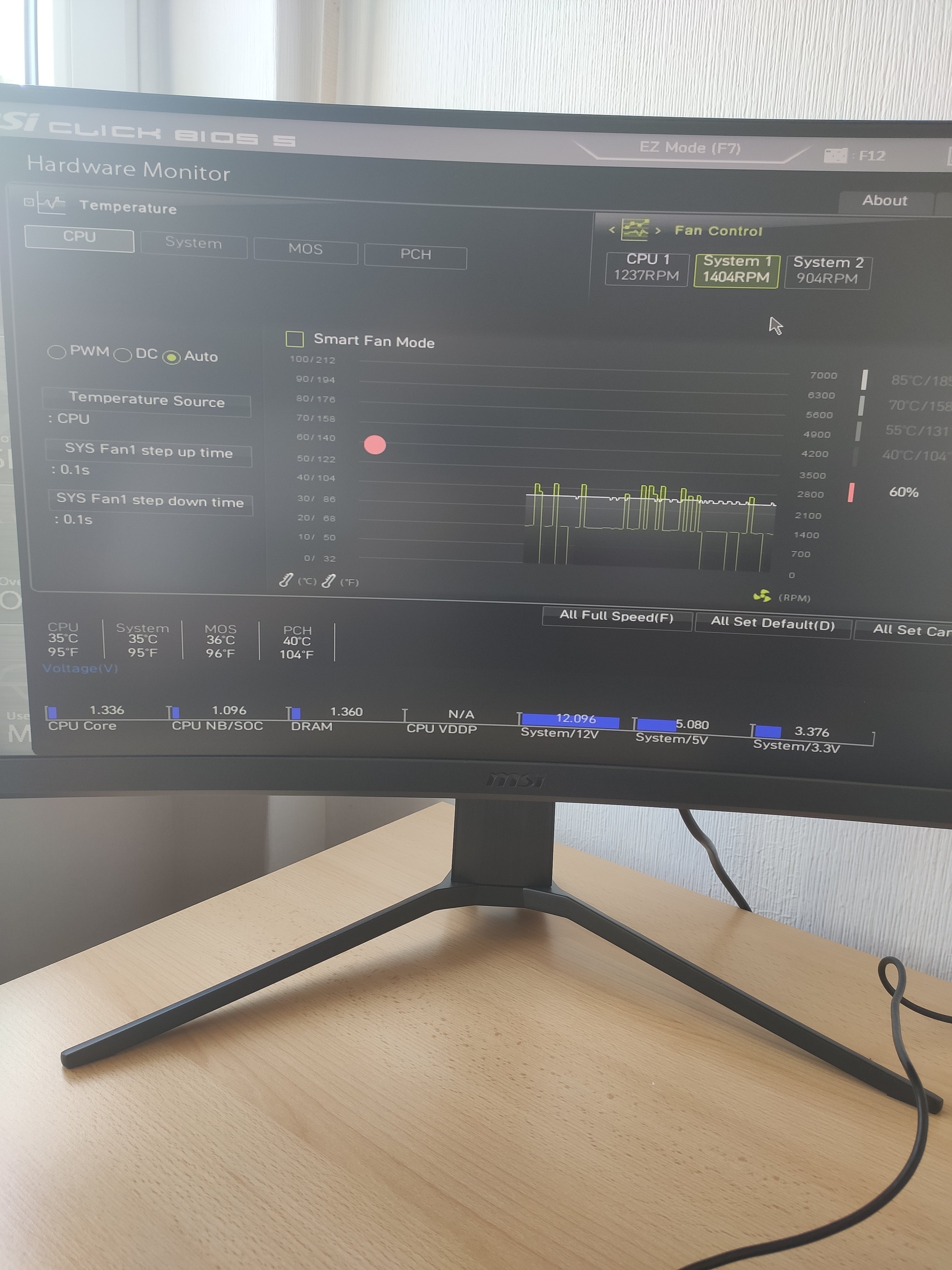 Beim System-Lüfter 1 stimmt was nicht. Ich vermute, dass er den Auto-Modus nicht richtig unterstützt. Der Sinn vom Auto Modus soll sein, dass dein Bios selber erkennt, welche Art Lüfter (3 oder 4 Pin) am Motherboard angeschlossen ist. Wenn der Lüfter einen 3-Pin-Stecker hat stelle hier auf "DC" um. Bei 4-Pin auf PWM.