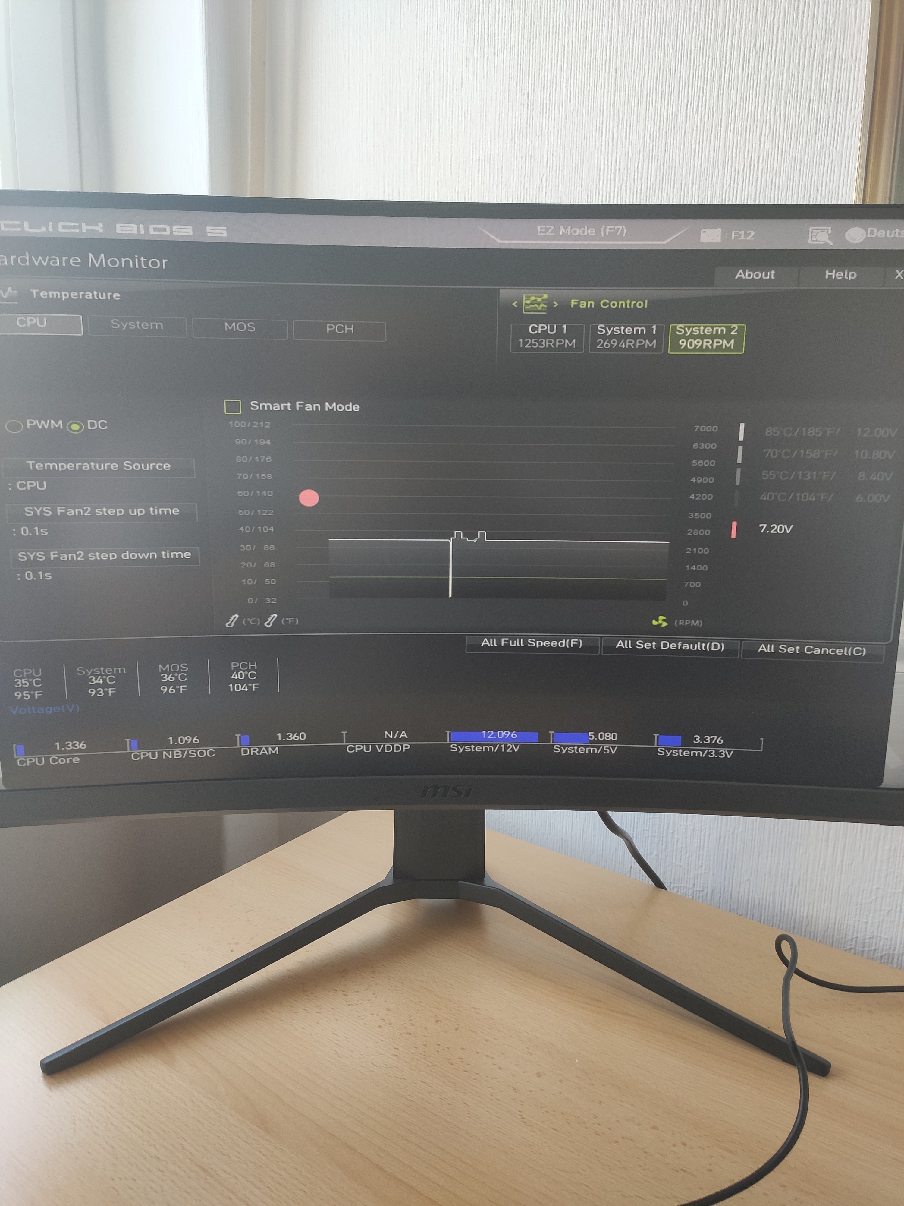 Falls er, wie der CPU-Lüfter, abhängig von der CPU-Temperatur gesteuert werden soll, sollt die Lüfter-Kurve der des CPU-Lüfters entsprechen. Würde die Gehäuse-Lüfter mal nach der Temperatur der Spannungswandler (MOS) regeln.