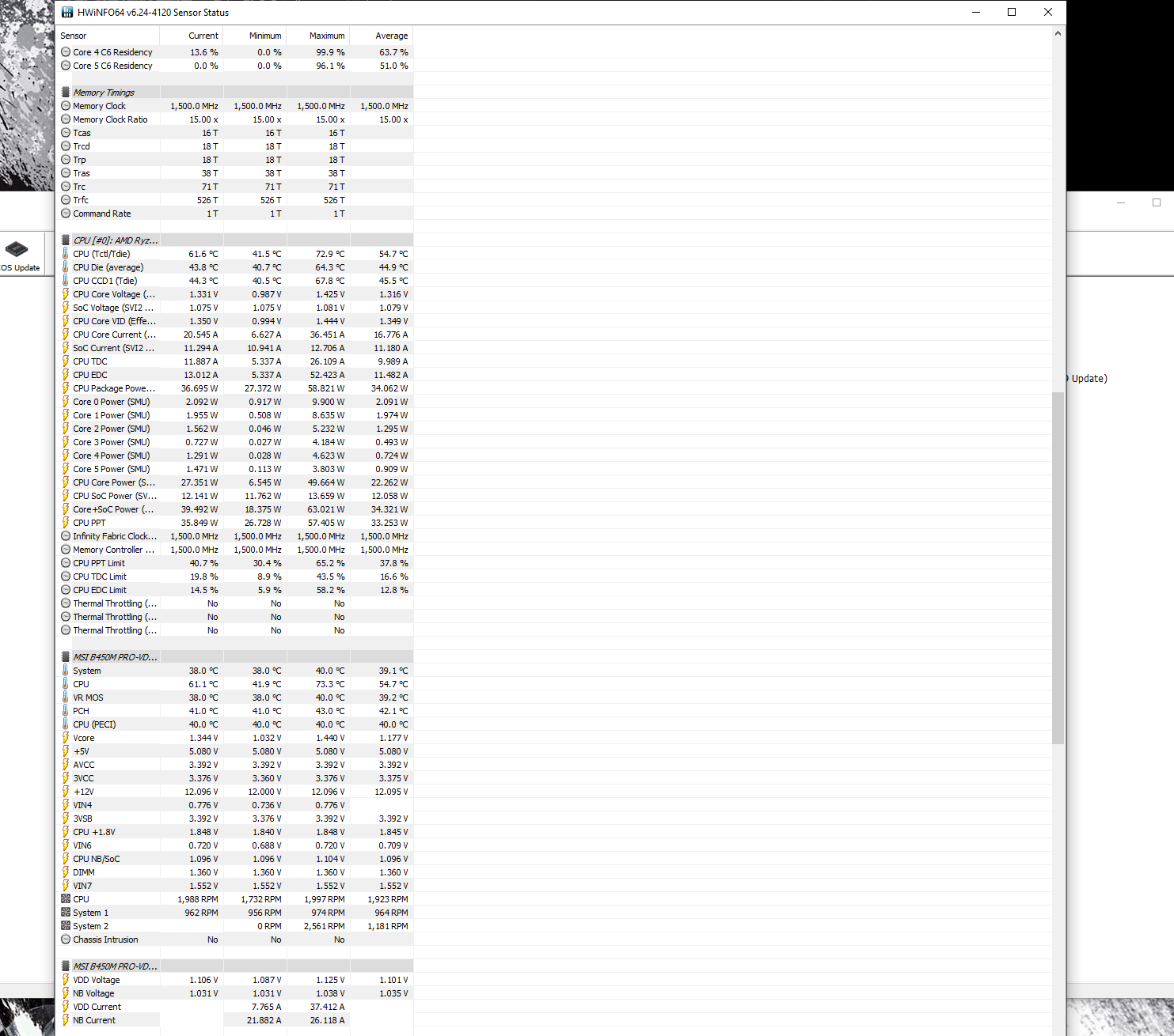 Mir fällt auf, dass dein CPU Lüfter recht langsam dreht. Wie in meinem Screen zu sehen, ging der Boxed hier auf ~2600 rpm. Peaktemperaturen sind so eine Sache, der Boost regelt die CPU entsprechend runter, damit diese nicht dauerhaft erreicht werden bzw. das System abschalten müsste.