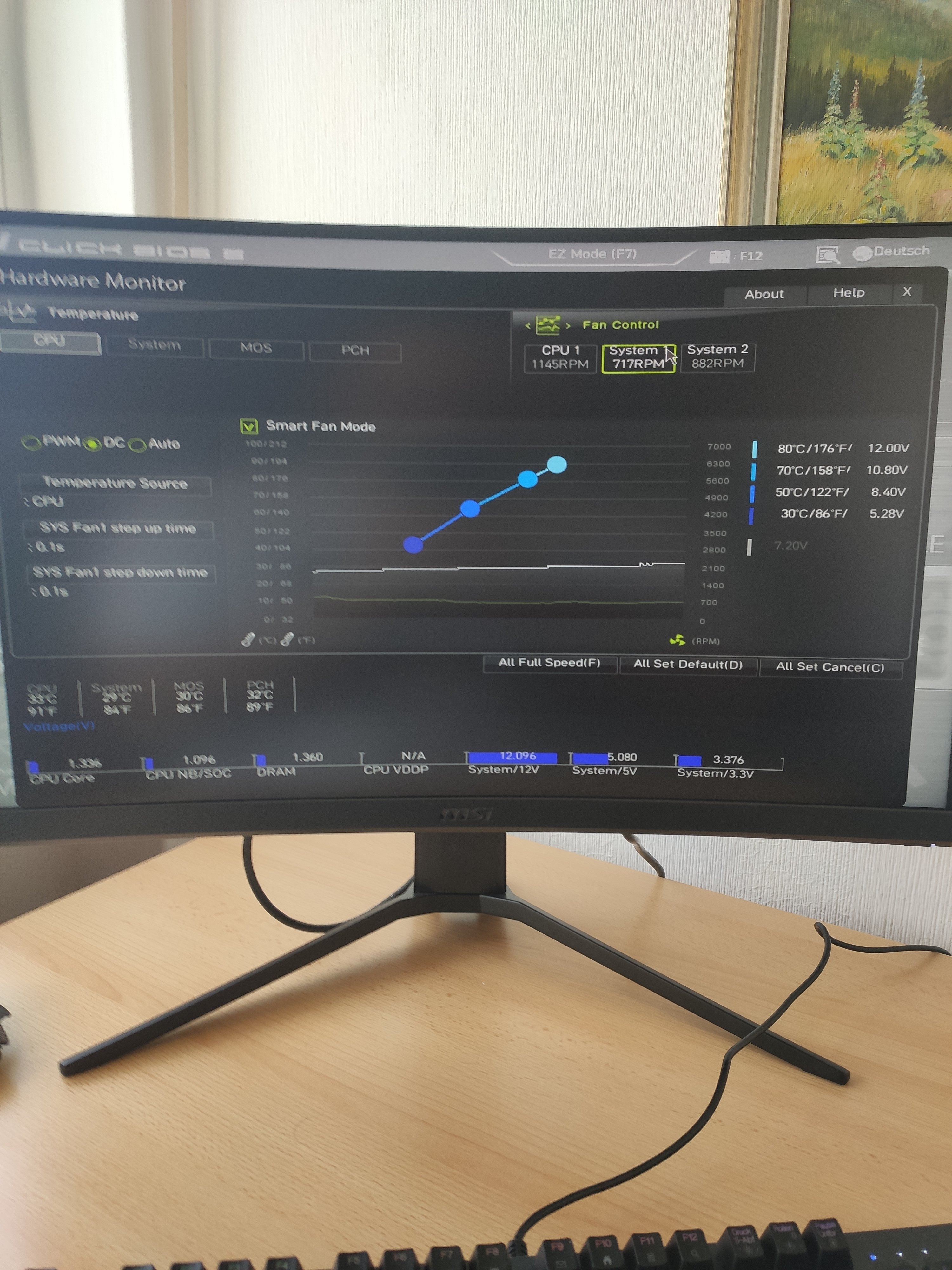 Du kannst dir von MSI auf der Seite, wo die Programme für dein Motherboard angeboten werden mal das "Dragon Center" herunter laden und installieren. Hier kannst du auch die Lüfterkurven einstellen und musst dazu nicht immer ins Bios wechseln. PWM oder DC für die einzelnen Lüfter musst du aber vorher im Bios festlegen. Das geht nicht im Dragon Center.