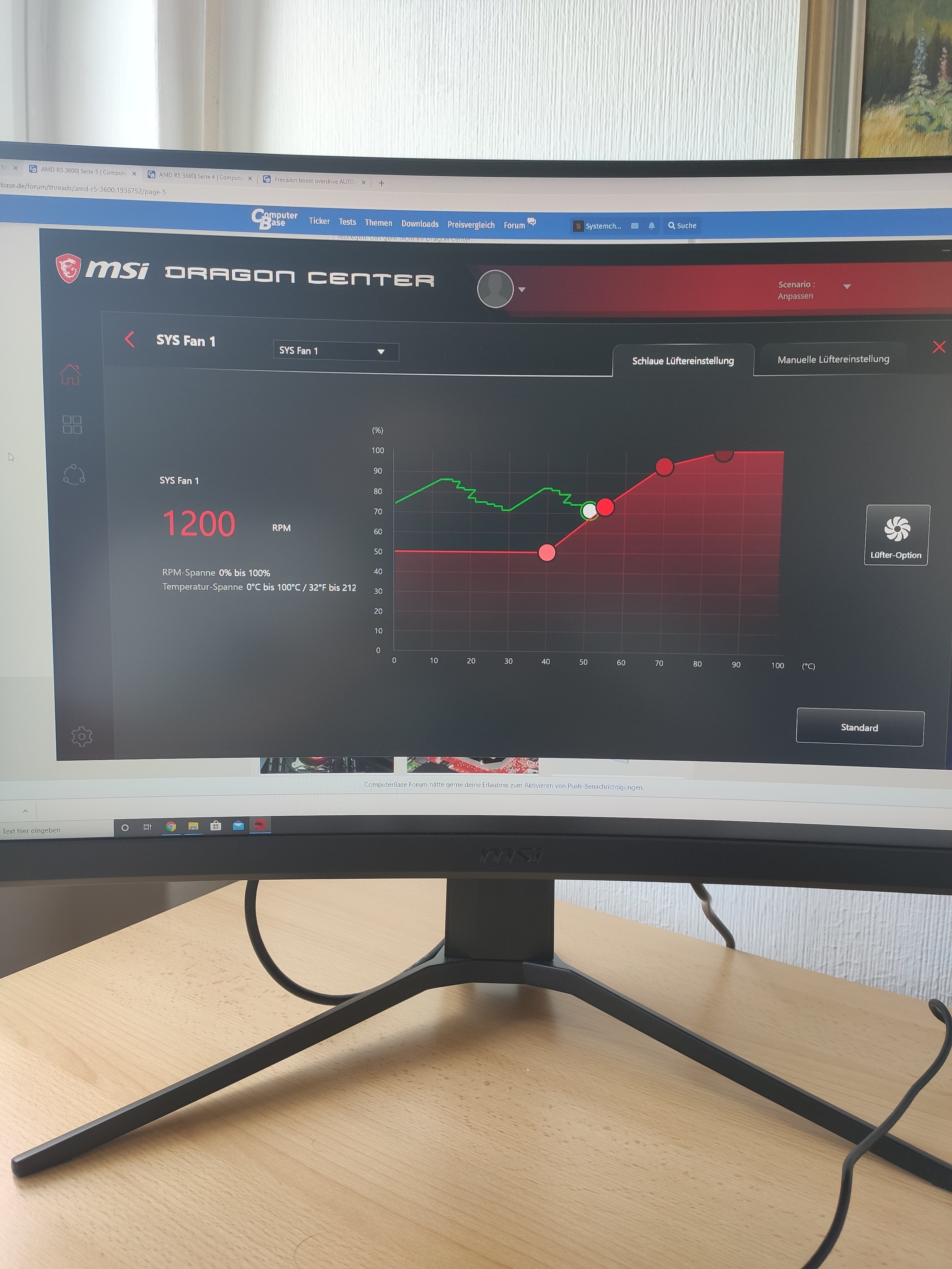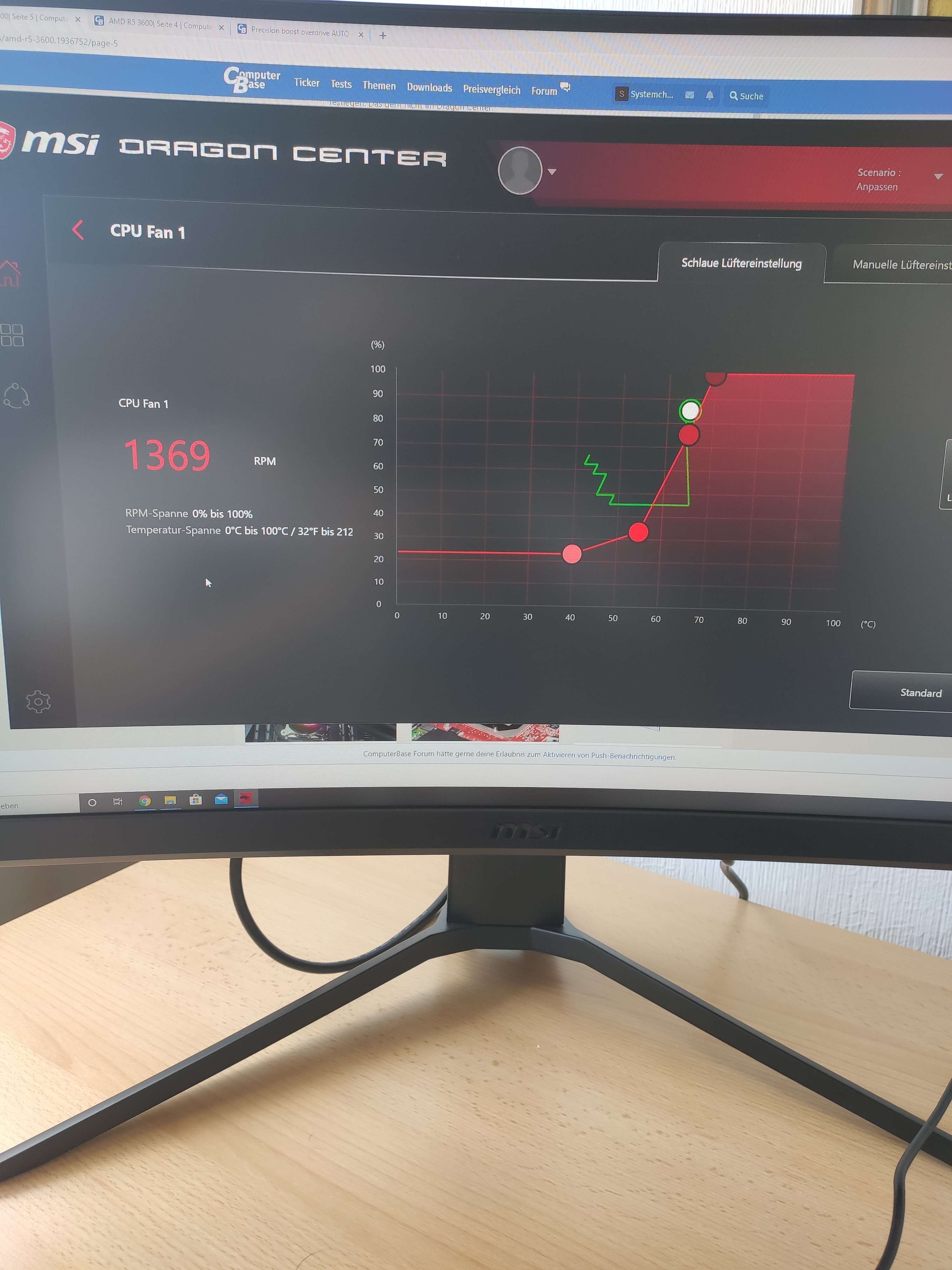 Klickst du auf den Button "Lüfter-Option" werden alle Lüfter über ihren komplett möglichen Drehzahlbereich geregelt. Das dauert so 1 bis 2 Minuten. Eine vorher im Dragon Center eingestellte Lüfterkurve geht dabei aber verloren und muss neu eingerichtet werden.