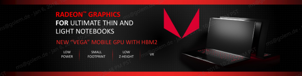 Bei diesem AMD Produkt könnte es sich um die auf der CES 2018 angekündigte "Vega Mobile" handeln. Ähnlich zu der Kaby-Lake-G Lösung, bei der ein AMD Grafikchip mit einem Intel Prozessor kombiniert wird. In diesem Fall stattdessen wohl eher mit einem AMD Ryzen Prozessor. Hier zwei Bilder von der CES: