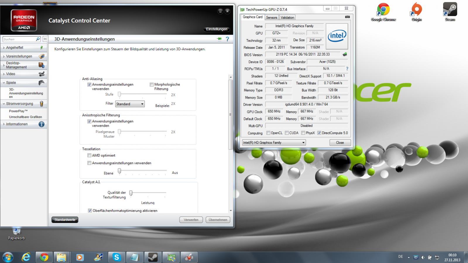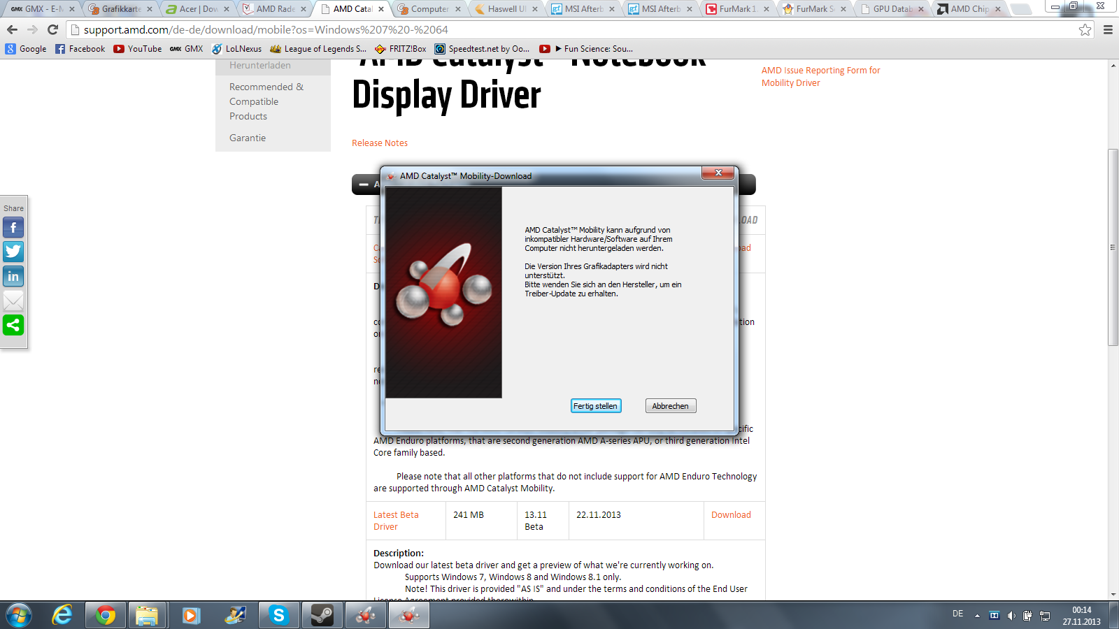 Ich habe probiert manuell Treiber von der AMD Website runterzuladen, aber das war nicht möglich. Der Acer Support meinte dass nur die von Ihnen getesteten Treiber mit dem Gerät kompatibel sind. Aktualisierung im Catalyst Control Center ist auch nicht möglich.