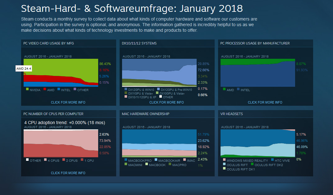 wenn der trend weiter anhält hat amd zum gaming navi release noch maximal 3-5% am gaming markt aus altbeständen - und bei so einer irrelevanz am markt kann man bei der softwareabhängigkeit von gaming gpus das thema imho auch direkt begraben. zum thema raven ridge: das wird hier nicht viel ausmachen, zieht wegen mir von intel 50% ab und rechnets zu amd dazu - mehr wird das durch APUs kaum werden. nochmal zur erinnerung, hier gehts NUR um gaming am desktop rechner - nicht office oder media pcs oder so (hole mir bald auch ein RR).