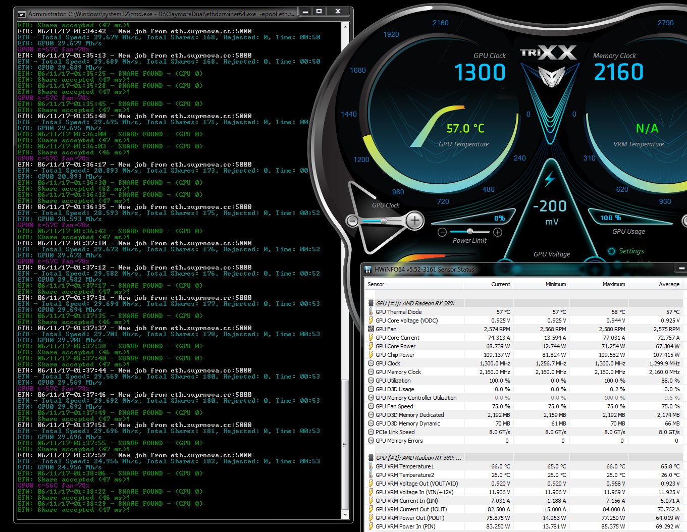 Wichtig dabei: Die Lüfter müssen wirklich arbeiten. Wenn die Temperatur über 58° steigt, fangen die Fehler an. Trixx funktioniert besser als Wattman. Bei Wattman fällt die Geschwindigkeit nach einer Weile ab, obwohl sich an der Anzeige nichts ändert. 30,5 gehen mit mehr GPU Takt, aber die etwa 29,5 mit weniger Verbrauch gefallen mir besser - und die Lüfter kommen noch mit.