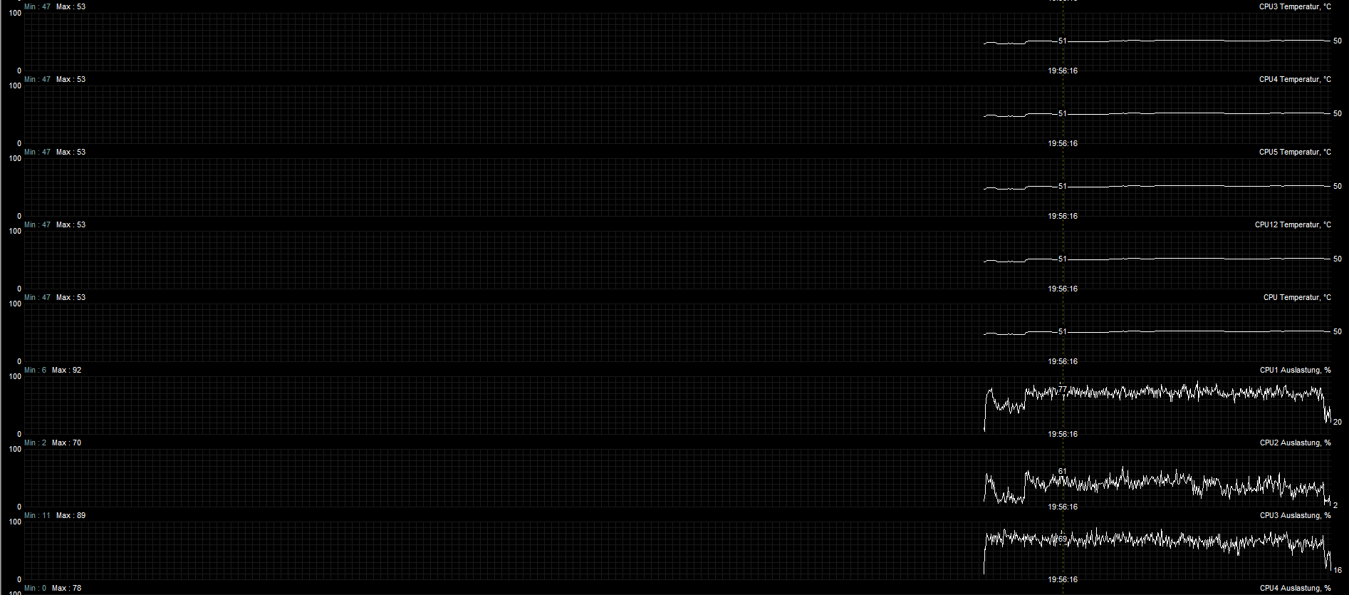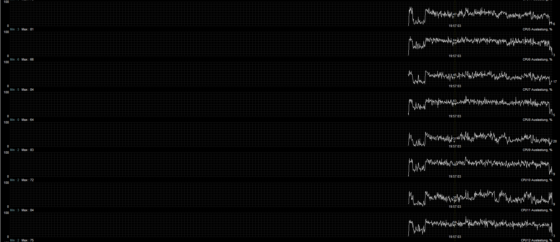 der 2600 hat 12 threads, der kann bereits bei 8,33% gesamtlast am limit sein. dafür muss laut anzeige auch kein einziger thread bei 100% sein. die angezeigte auslastung der CPU ist mehr oder weniger nutzlos um nem limit auf die spur zu kommen.coooyah schrieb:So wie ich das sehe sind weder GPU noch CPU jemals zu 100% ausgelastet.[...]Kann das jemand erklären?