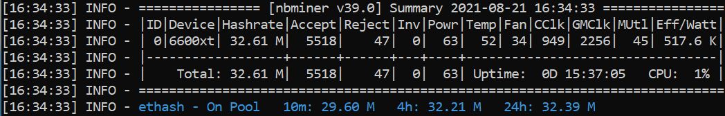 Ich weiß ja nicht, was "Dizzy Mining" da macht, aber bei mir zeigt der Adrenalin 62/63 Watt an und die USV schwankt zwischen 70-75 Watt. Auch die 32 MH/s sind einfach zu erreichen (Sapphire Nitro+ 6600XT Gaming OC). Wie andere da um die 50 Watt erreichen ist mir schleierhaft (Hive OS bietet aber wohl bessere Möglichkeiten)...